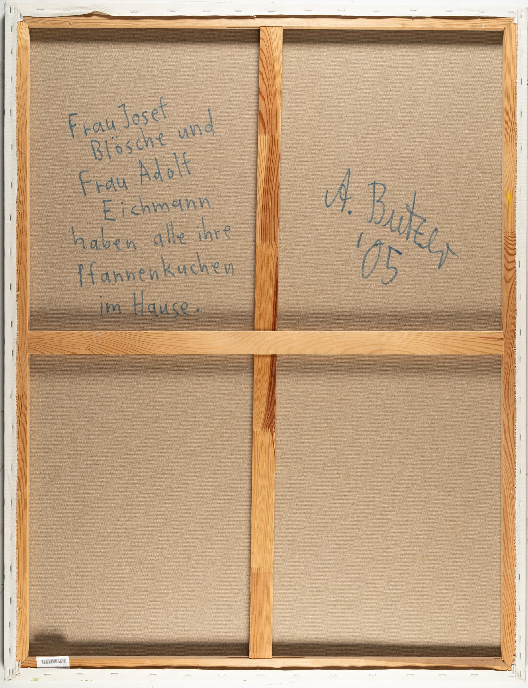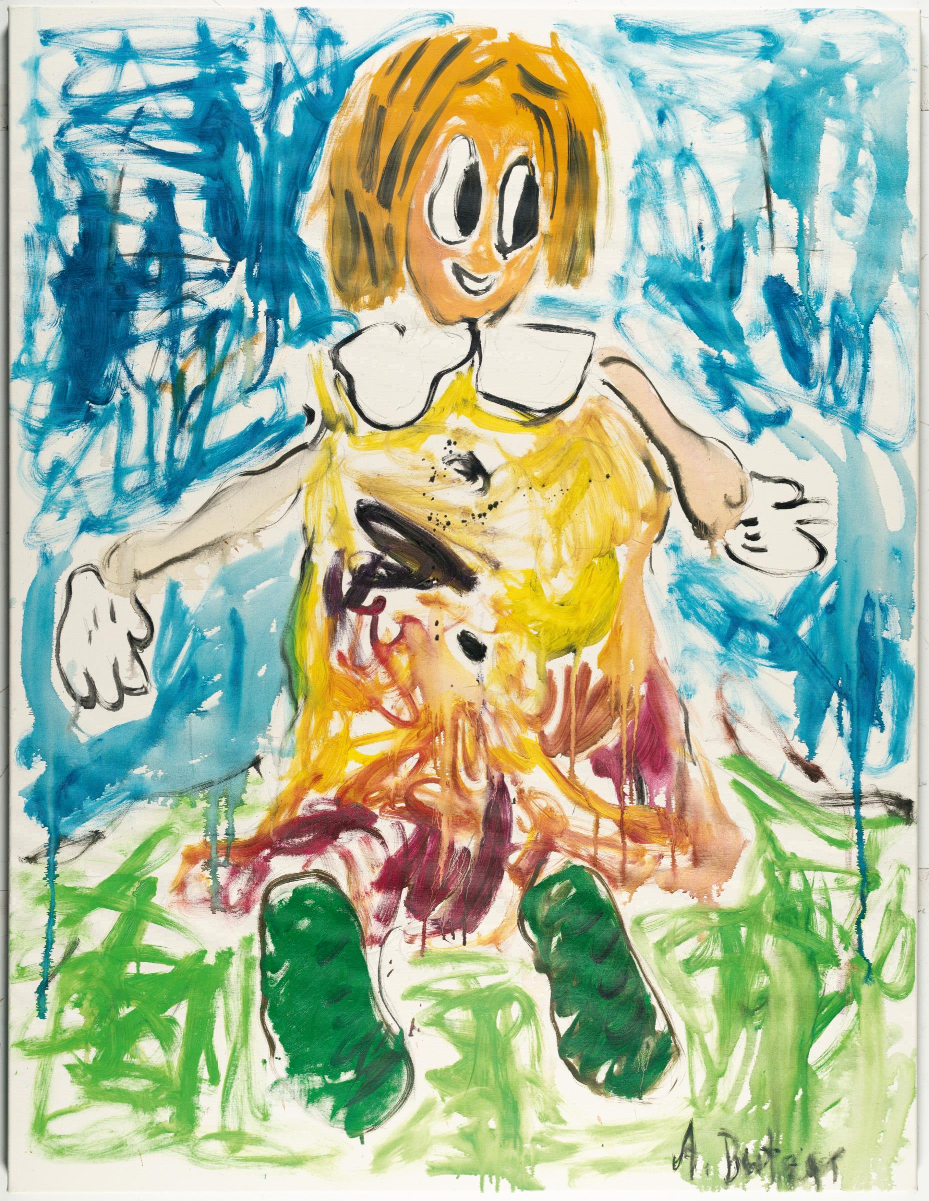 As a painter, André Butzer has created a unique, complex universe that combines European expressionism with American pop culture. His works reflect the artistic and political extremes of the 20th and 21st centuries. Butzer himself describes his painting as science fiction expressionism, without following narrative pictorial structures. Characteristic figures populate Butzer's scenes; they have oversized comic eyes, large heads and doll-like hands, which makes his work unique. His role model is unmistakably Walt Disney, but the artist also cites Edvard Munch, Henri Matisse, Friedrich Hölderlin and Henry Ford as influences. In the luminous figure from 2005, Butzer explores the fundamental dimensions of color, light and painterly expression.