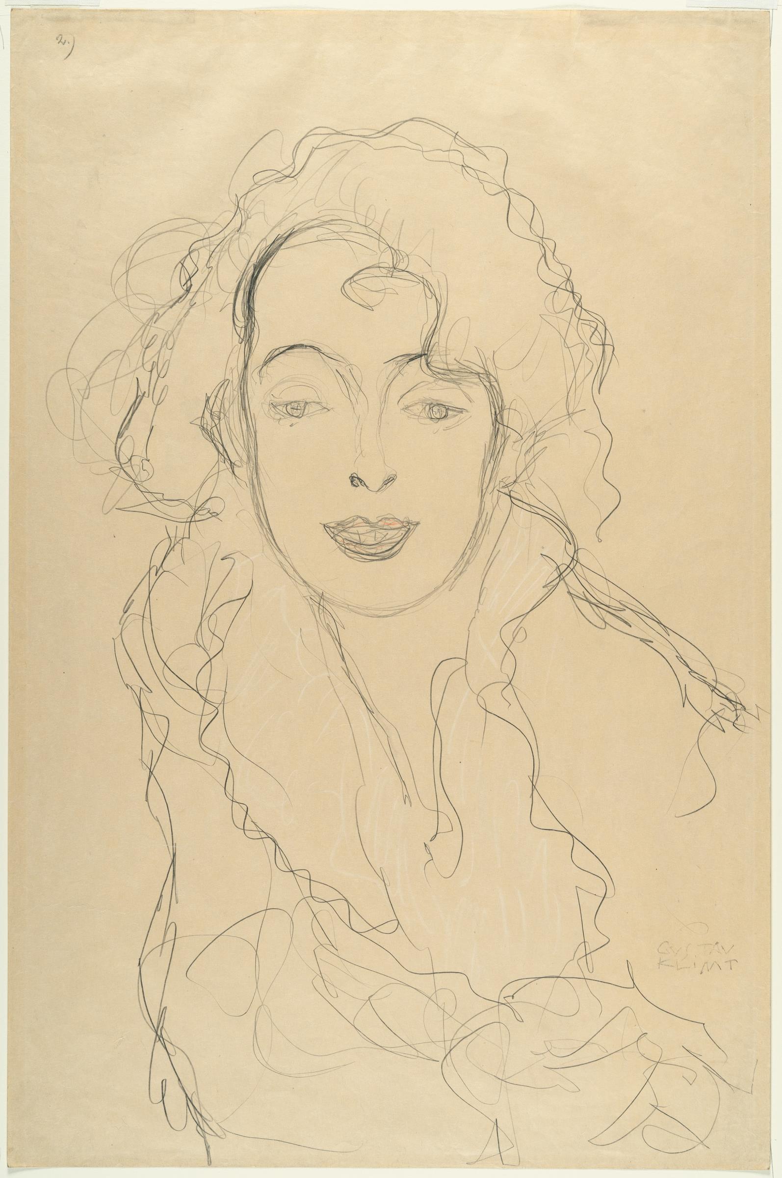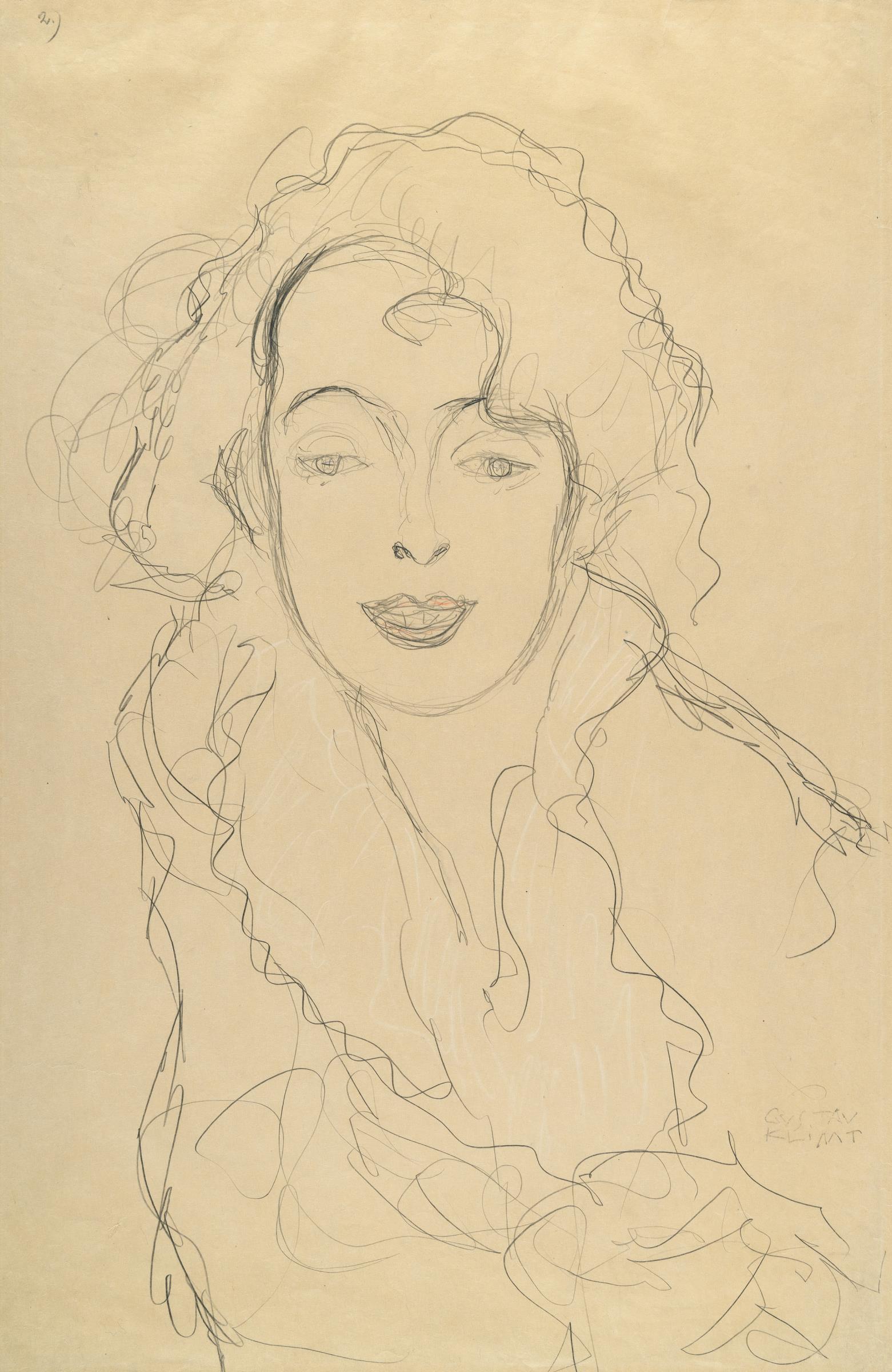 This remarkable drawing by Gustav Klimt shows an unnamed female model. With her large eyes and slightly parted red lips, the lady is an archetypal Klimt figure. Her pose radiates a quiet grace and a subtle but strong attraction. She leans her body slightly forward, her attention focused entirely on the viewer. Klimt uses flowing lines to create a sensual yet intimate atmosphere. Klimt's drawings are usually connected to his paintings. The present drawing was probably created as a preparatory work for the work "The Girlfriends", which was destroyed in 1945 at Immendorf Palace.