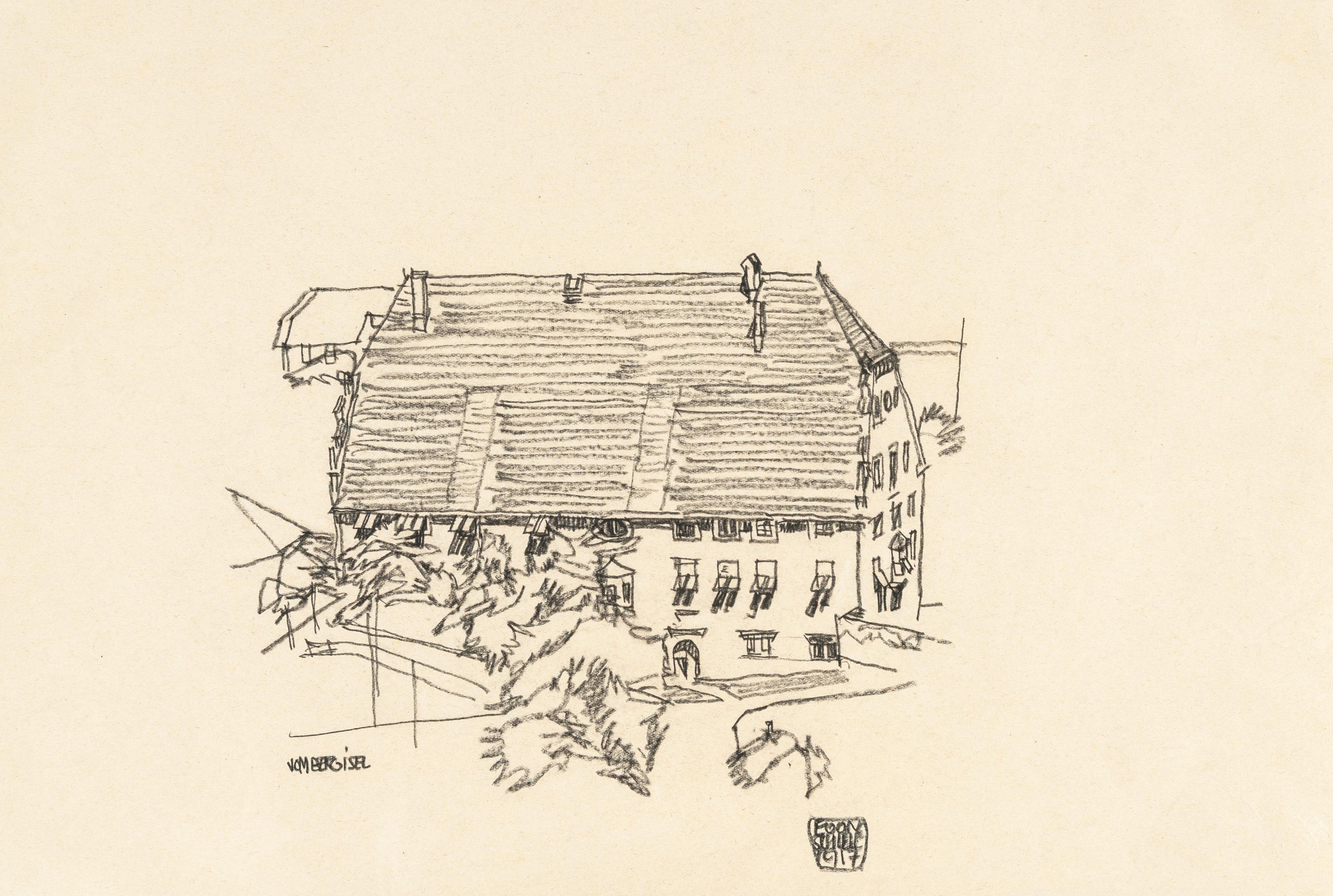 The present sheet "Vom Berg Isel" was created in this context - initially in the sketchbook, but the signature and dating turn it into an independent work. The black, precisely placed lines capture the house with calm concentration. The architecture seems at once firmly anchored in the slope and permeated by an inner rhythm. Schiele's gaze remains analytical, but not sober: the trembling of the line, the slight slant of the forms, the compression of the vegetation - all this lends the building a quiet vitality.