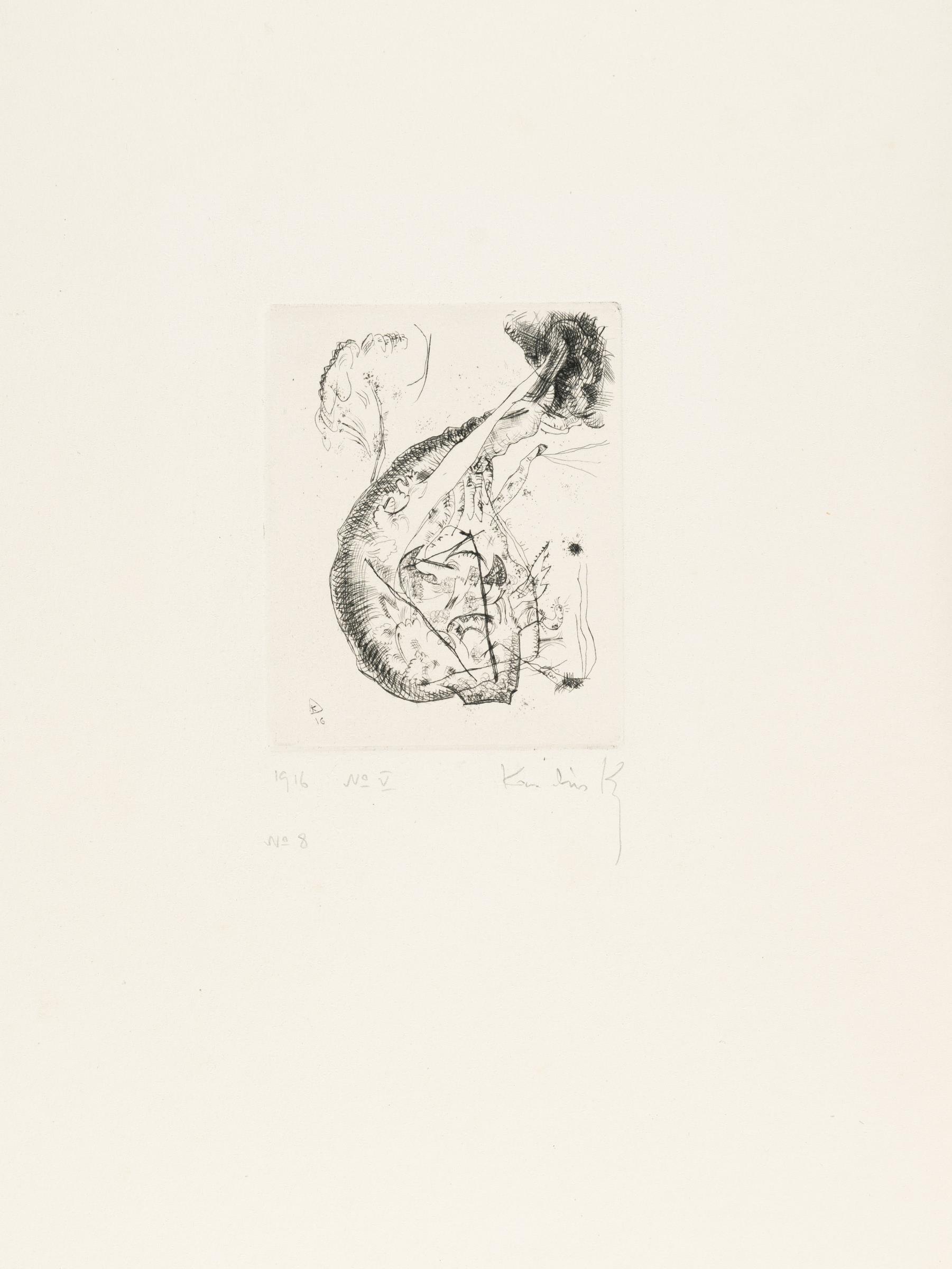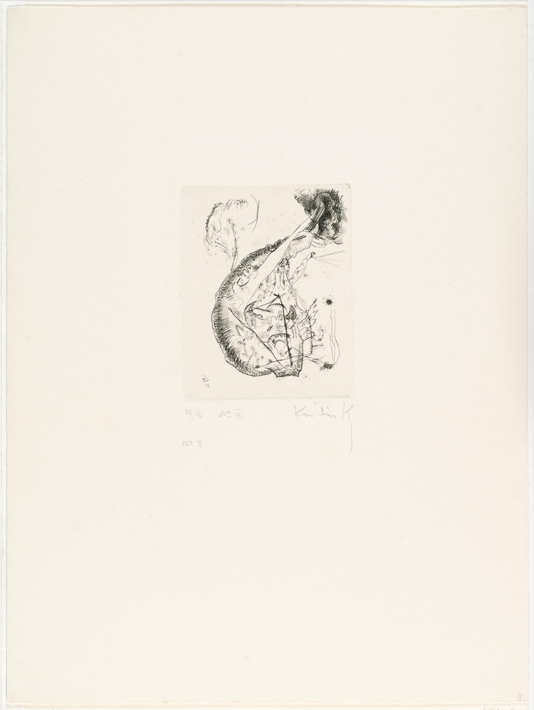 On February 2, 1915, he wrote to Gabriele Münter: "Maybe I'll do some engravings." Work on the etchings could therefore have already begun in the course of 1915. However, they were not printed until the beginning of 1916 in Stockholm, where Kandinsky and Gabriele Münter met at Christmas 1915. A total of six drypoint works titled with Roman numerals were created in 1916, all of which were published in an edition of only 10 numbered copies. The repertoire of motifs on display evokes associations with Russian fairy-tale figures, ladies in hoop skirts and body parts, some of which swirl through the room in breathtaking poses.