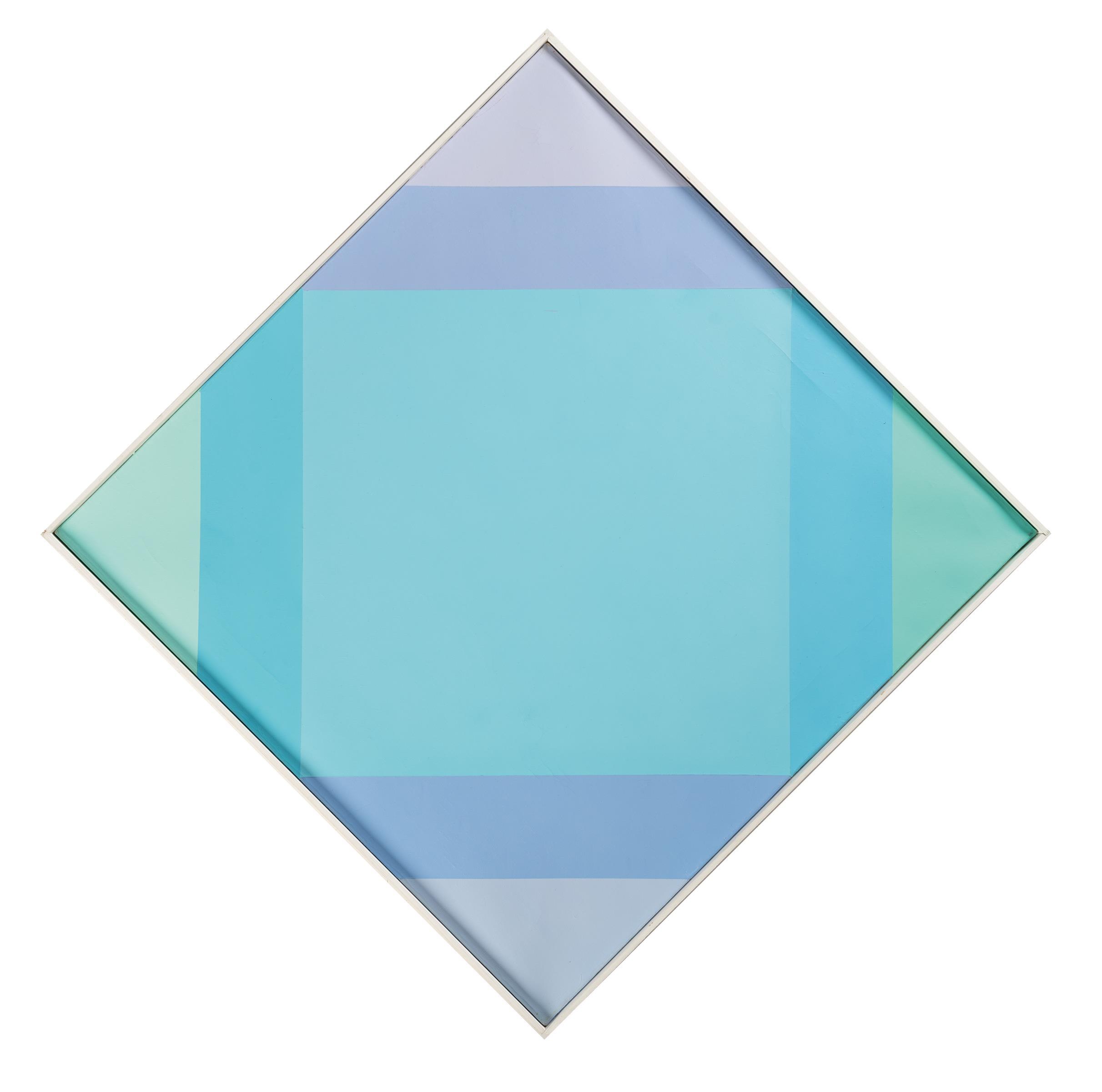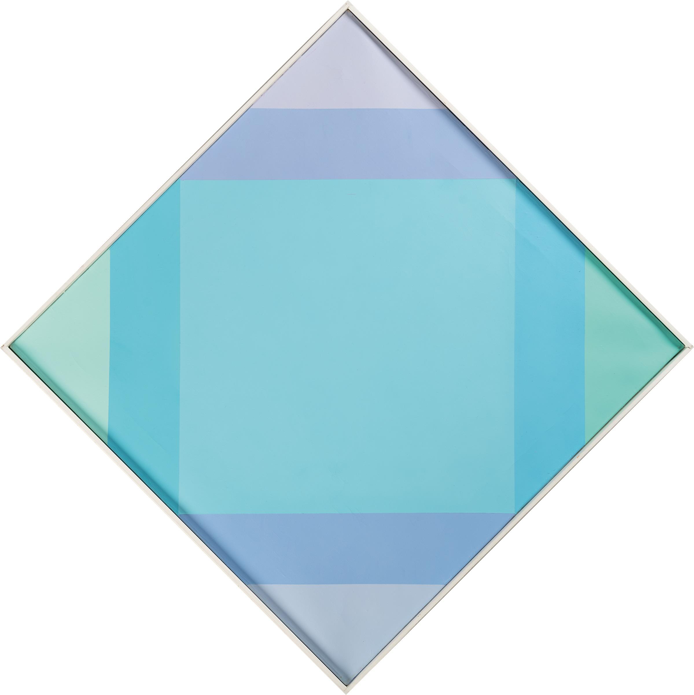 Logical processes and a return to mathematical and geometric principles form the basis of Max Bill's pictorial design. "Strahlung gedämpft" is part of a series that exclusively comprises overlapping pictures and which Max Bill described as "pointed pictures". The structure of the pictures, which are carefully thought out in terms of color and composition, generally develops from the basic shape of the square. In a warm light blue, this also forms the center of the unusual format here. It is framed by dark violet and color-coordinated blue color bars, while isosceles triangles in soft violet and turquoise occupy the corners of the picture.