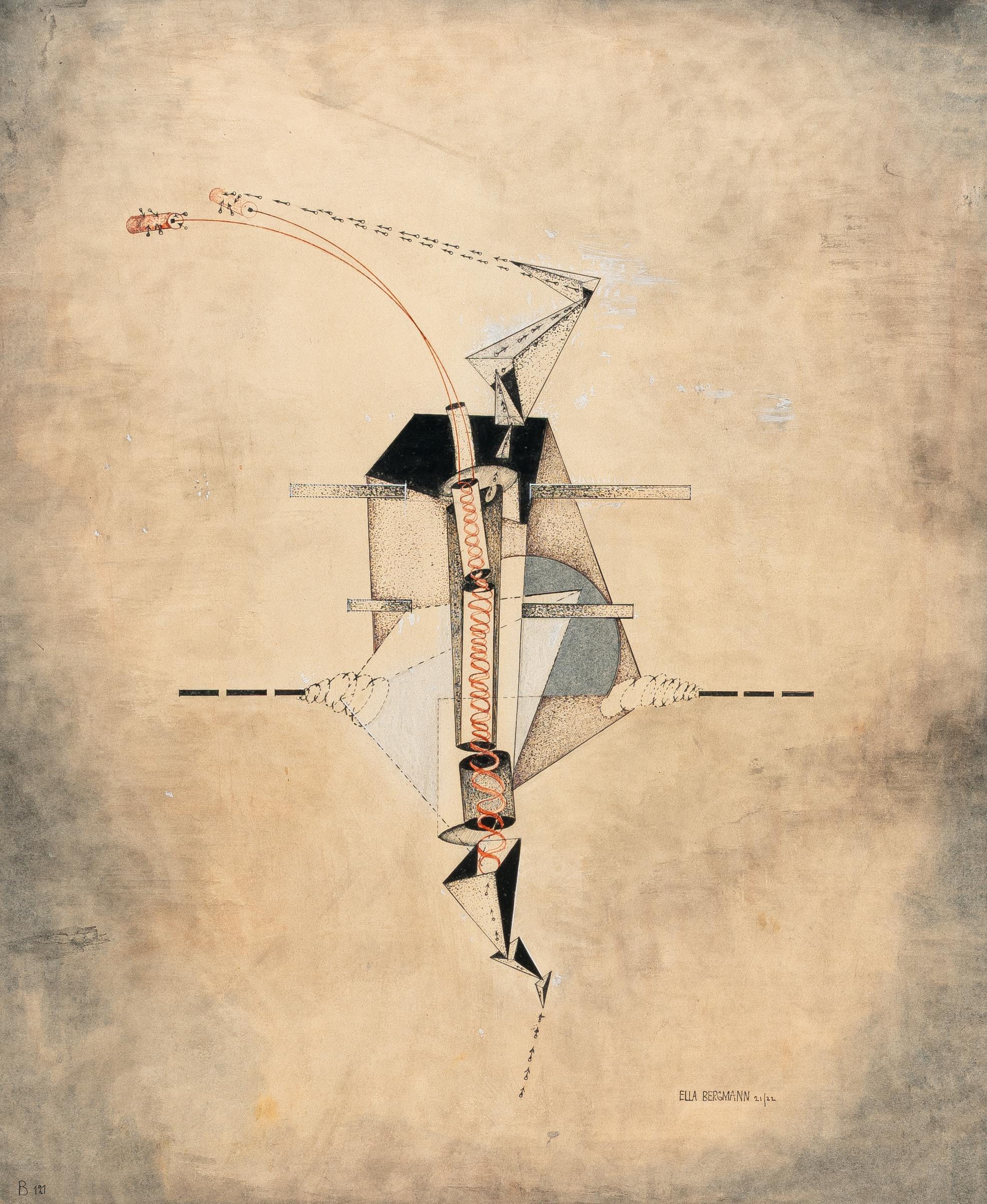 The functional vegetation is shown in geometricized individual forms, the interior of which is criss-crossed by tubes and arrow lines. The variety of interlocking and interdependent individual parts creates a dynamic and gives the work the character of a moving figure. Bergmann-Michel plays with the concepts of plant growth and the growth of mathematical functions, which appear as curves and graphs in the drawing.