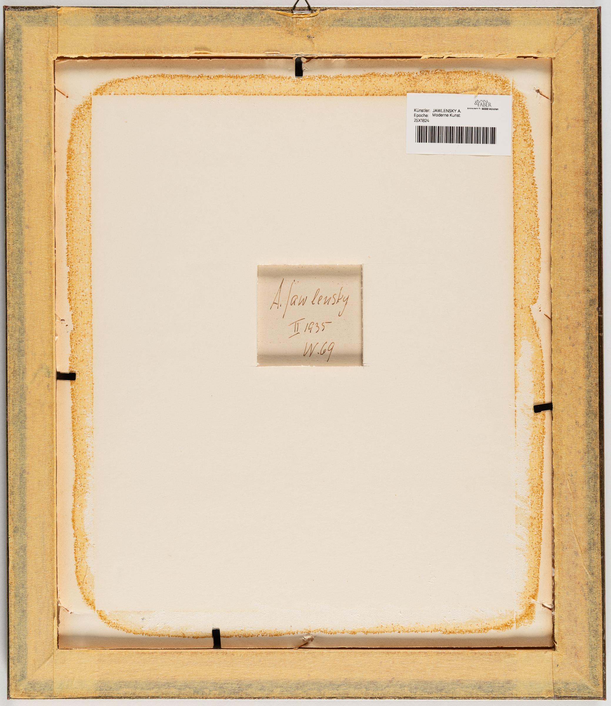 Recto inscribed by Lisa Kümmel, the artist's assistant, on the lower edge of the backing card: „II.1935. 69" and on the verso in the center: „A. Jawlensky II 1935 W.69" and on the lower edge „II.1935. I.A. N.69" (the „9" barely visible)