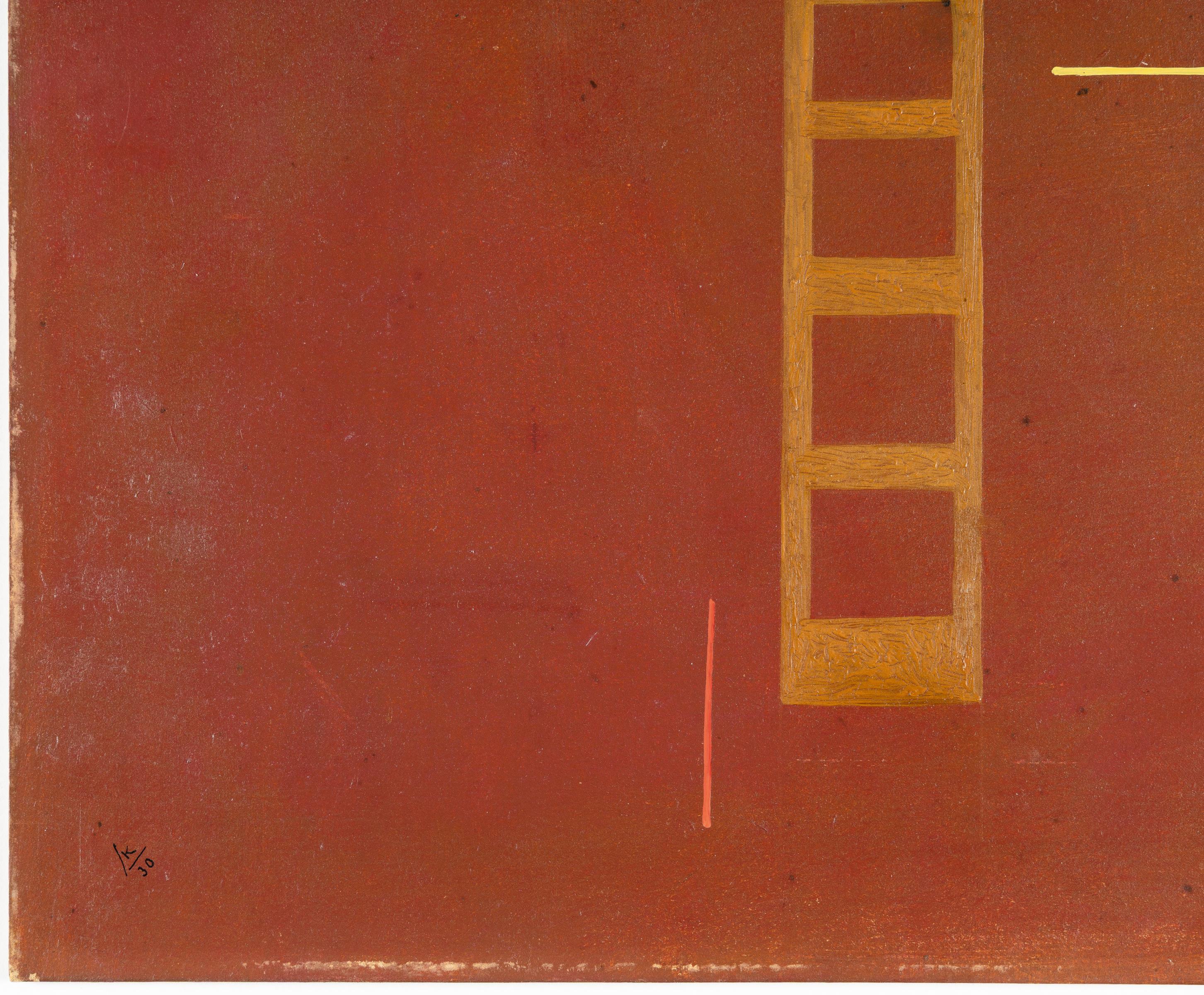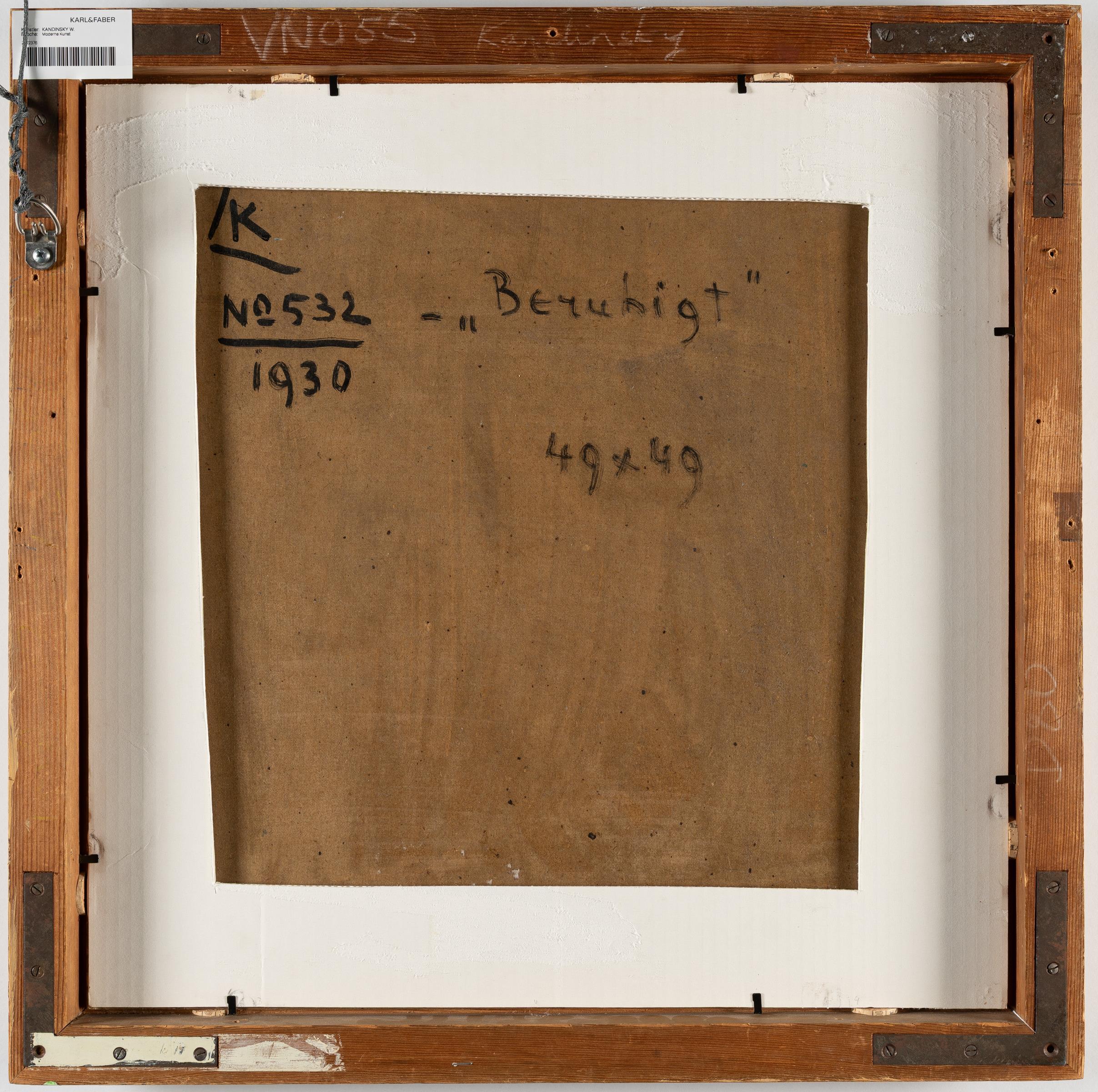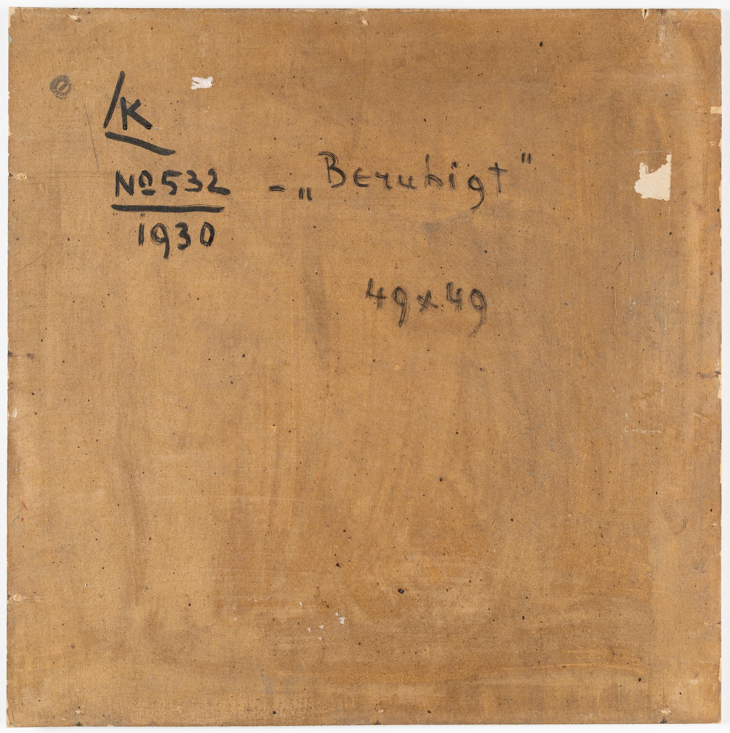 With "Calm", Kandinsky created a characteristic work of the "cool" period in 1930. Precisely placed forms, a balanced color composition and a calm, almost meditative order define the work. Various geometric shapes are spread across a square base without touching or overlapping. At the center of the composition is a light purple isosceles triangle - the visual heart of the picture. It is surrounded by other geometric elements - circles, rectangles and lines. The circular shapes, which are arranged from the upper left edge of the picture to the right edge, appear almost light. The circle, which for Kandinsky embodied the "synthesis of the greatest opposites", plays an important role in his work. He sees in it the union of heaviness and lightness, matter and spirit - a "form of the fourth dimension". This idea of balance and tension, of opposites in harmony, characterizes the formal structure of "Calm".