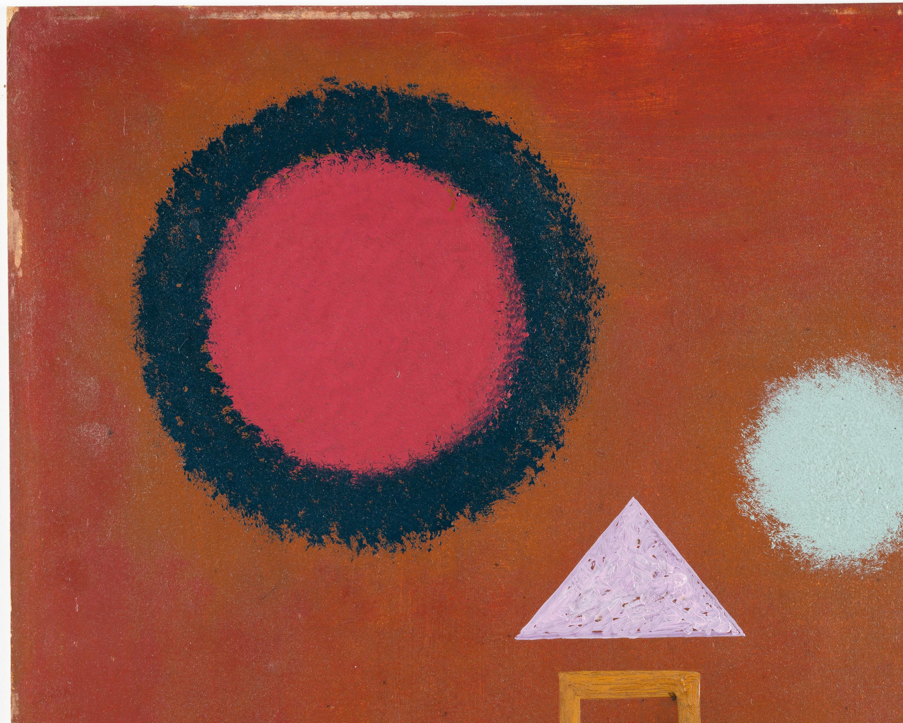 Due to the strictly constructed, static arrangement of clearly structured forms and the harmonious choice of colors, the title "Calm" appears programmatic. At the same time, it suggests that a more dynamic or at least a more unsettled state previously prevailed. However, the existing calm is not a stillness, but rather a vibrating balance, in which a subtle energy resonates in the dotted edges of the circle and the rippled ductus inside the triangle.