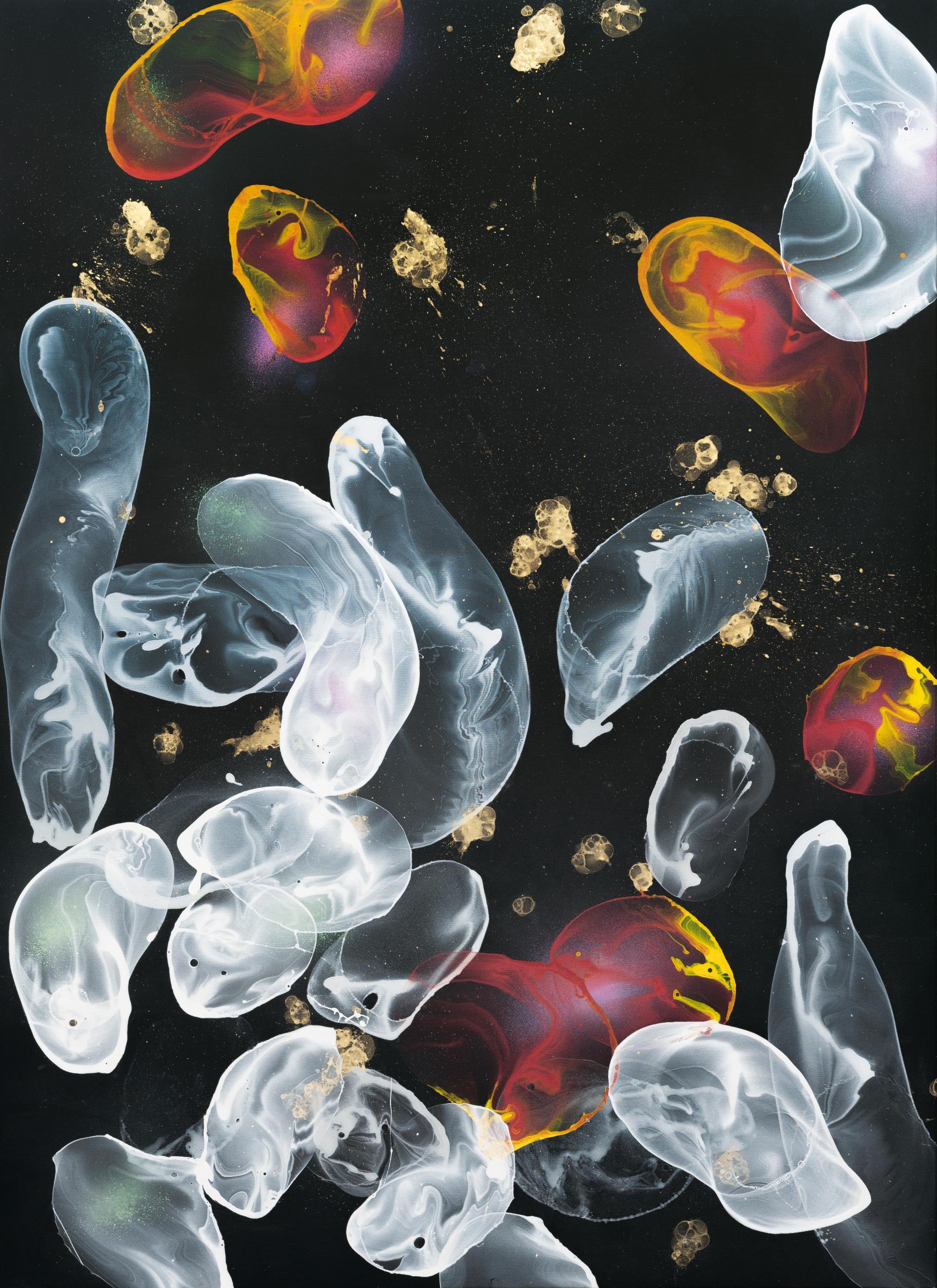 As one of the protagonists of the artists' group "Mühlheimer Freiheit", Dokoupil radically questioned the concept of art as early as the 1980s through experimental, unconventional creative processes. In the early 1990s, he began painting with candle soot, applying paint to the canvas with a whip and soon also bursting pigment-saturated soap bubbles on the canvas. A step into painterly no man's land, on the way to a reinvention of painting. For more than thirty years, Georg Dokoupil has been refining this method of image production, which incorporates the chemical processes that occur when soap bubbles burst. The Soap Bubble Paintings that emerge almost independently in this way are polyphonic. They change their colors as the light changes and from angle to angle. Basically, they are composed as non-figurative abstractions that avoid representation but still allow for associations. "False Memories" and "Broken Concepts" are what Georg Dokoupil calls the ingredients that characterize the production of the more recent Soap Bubble Paintings in particular: This results in autonomous, unforeseen images with a mystical aura, which is further exaggerated in the present painting by the strong color contrast.