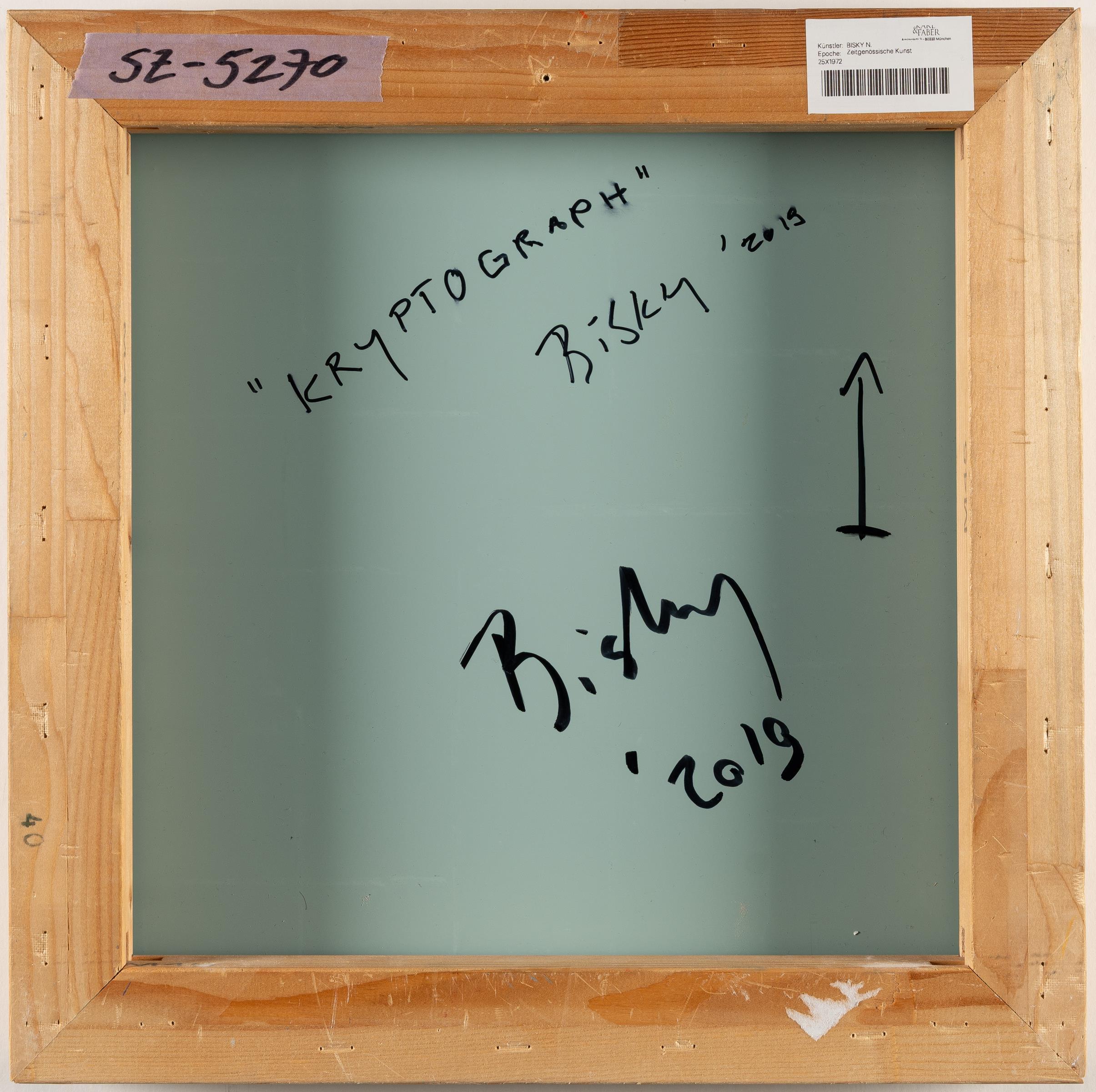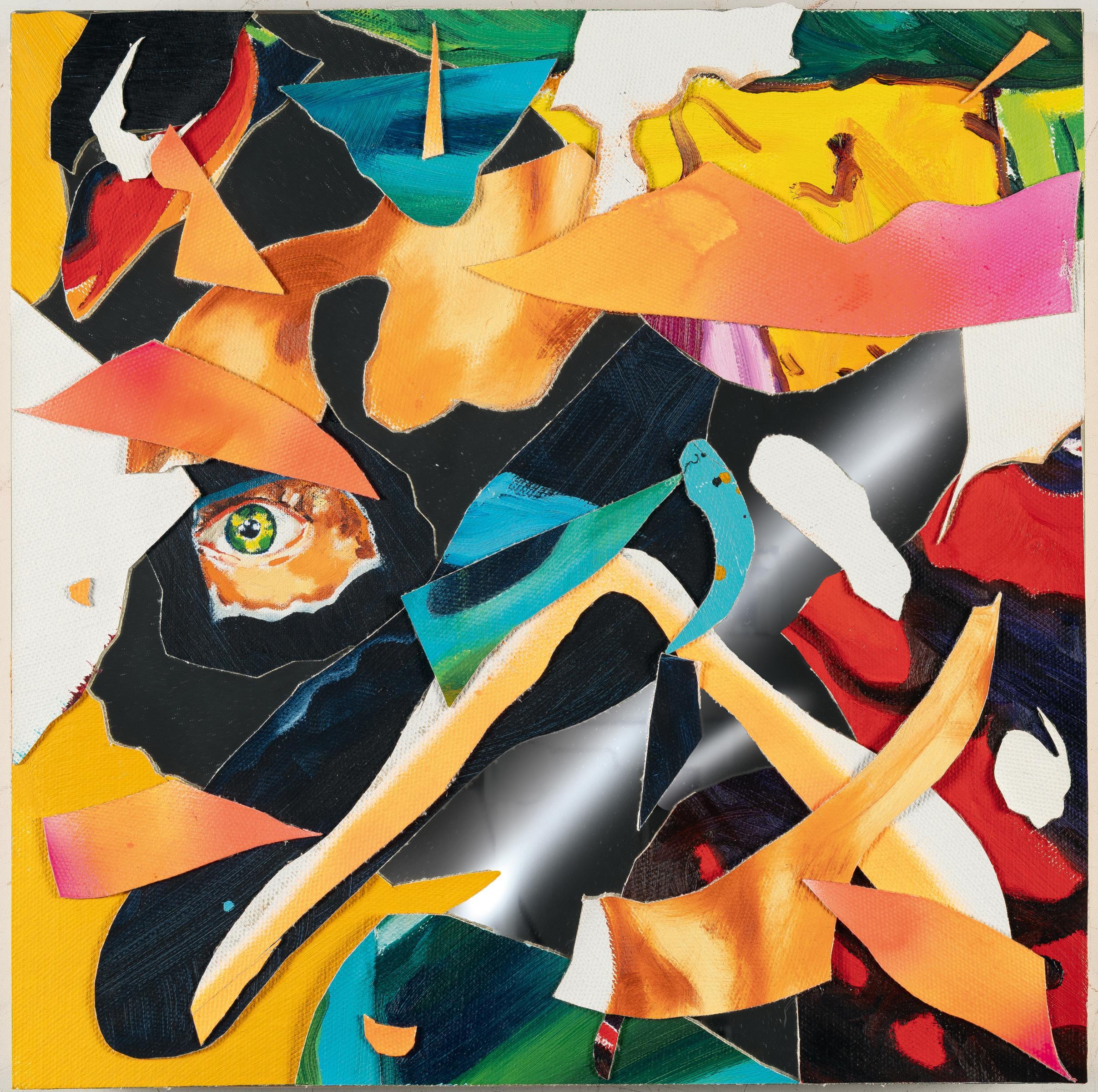 Collage mit Öl auf Leinwand, auf Spiegel. 2019. Ca. 40 x 40 cm. Verso auf der Spiegelrückwand zweifach signiert und datiert sowie betitelt und mit einem Pfeil bezeichnet.
