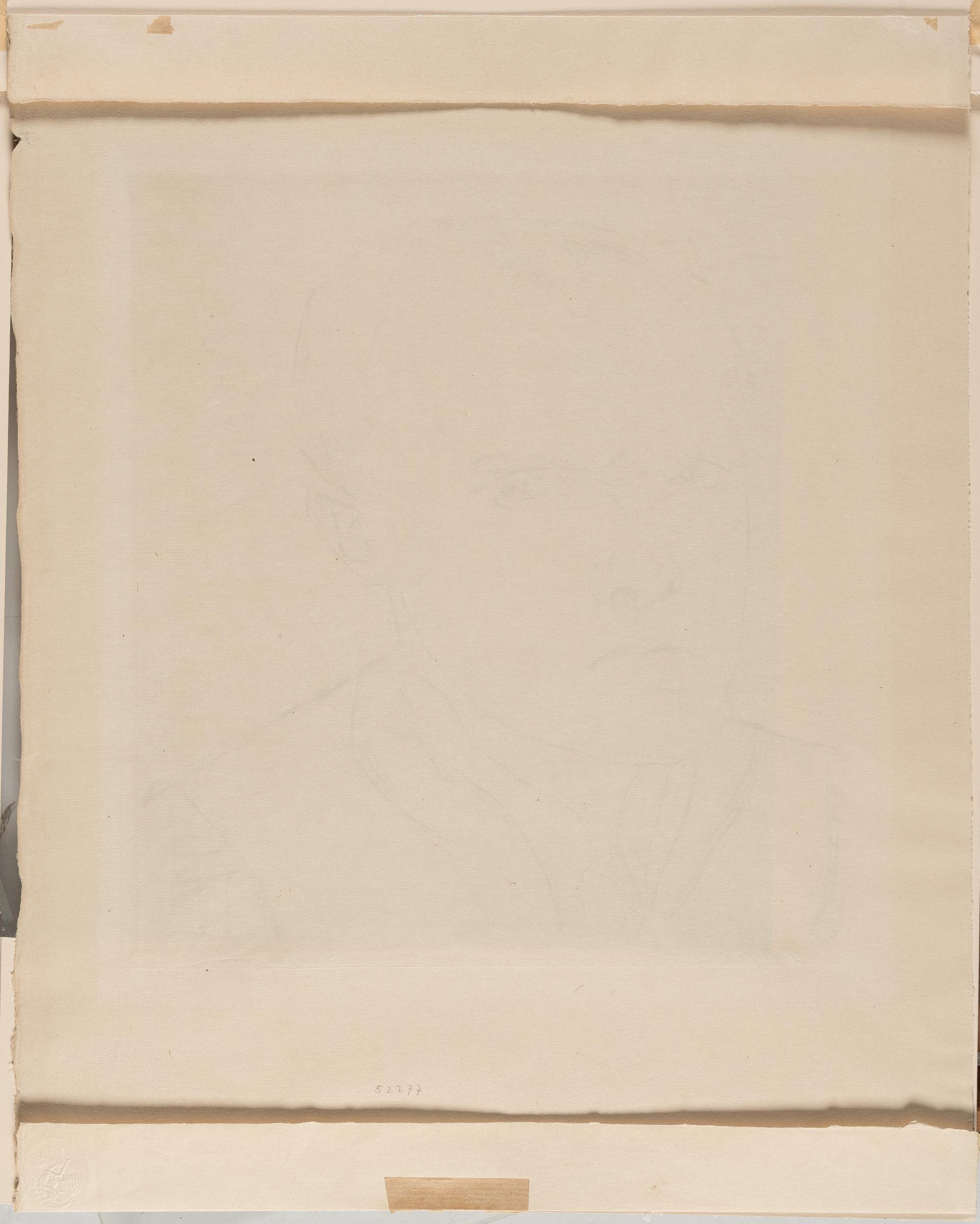 Unterm Passepartout schwach gebräunt, vereinzelte winzige Fleckchen, leichte Griffknicke. Links unterhalb der Darstellung leichte Druckstellen, rechts oben kleine Papierunregelmäßigkeit an der Kante. Oberer und unterer Blattrand jeweils mit horizontalem Falz und Montierungsbändern. Sonst insgesamt in guter Erhaltung.