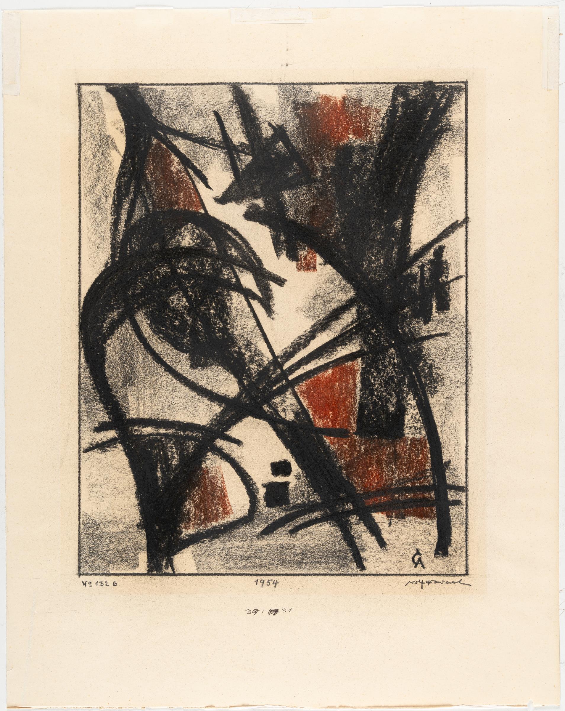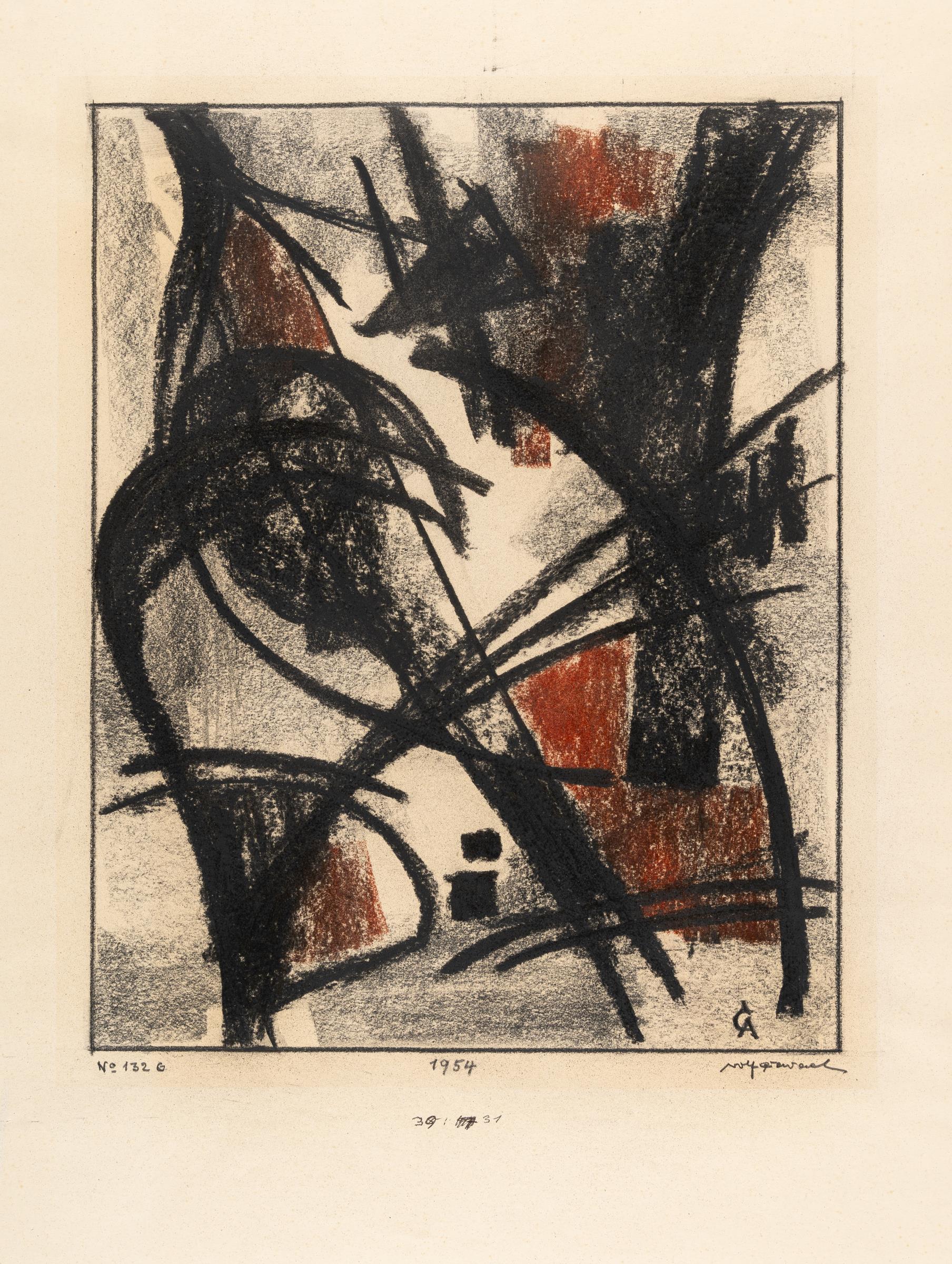 Blatt 1: Ölkreide, farbige Kreide über Bleistift über Monotypie auf Velin. 1954. Ca. 55,5 x 44 cm. Signiert und monogrammiert unten rechts, datiert unten mittig und betitelt unten links.