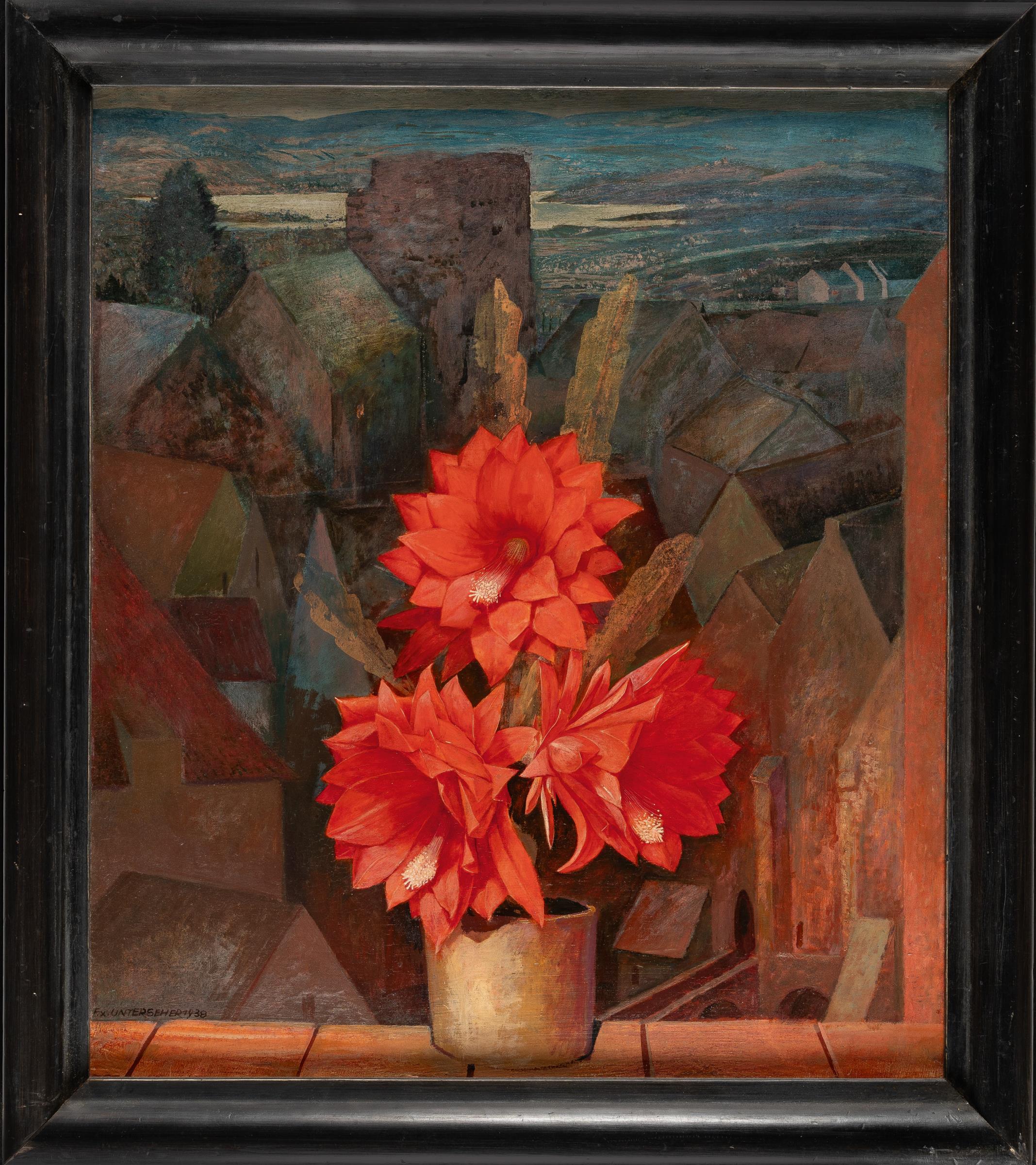 Fensterbrett mit rot blühendem Kaktus vor Dachlandschaft