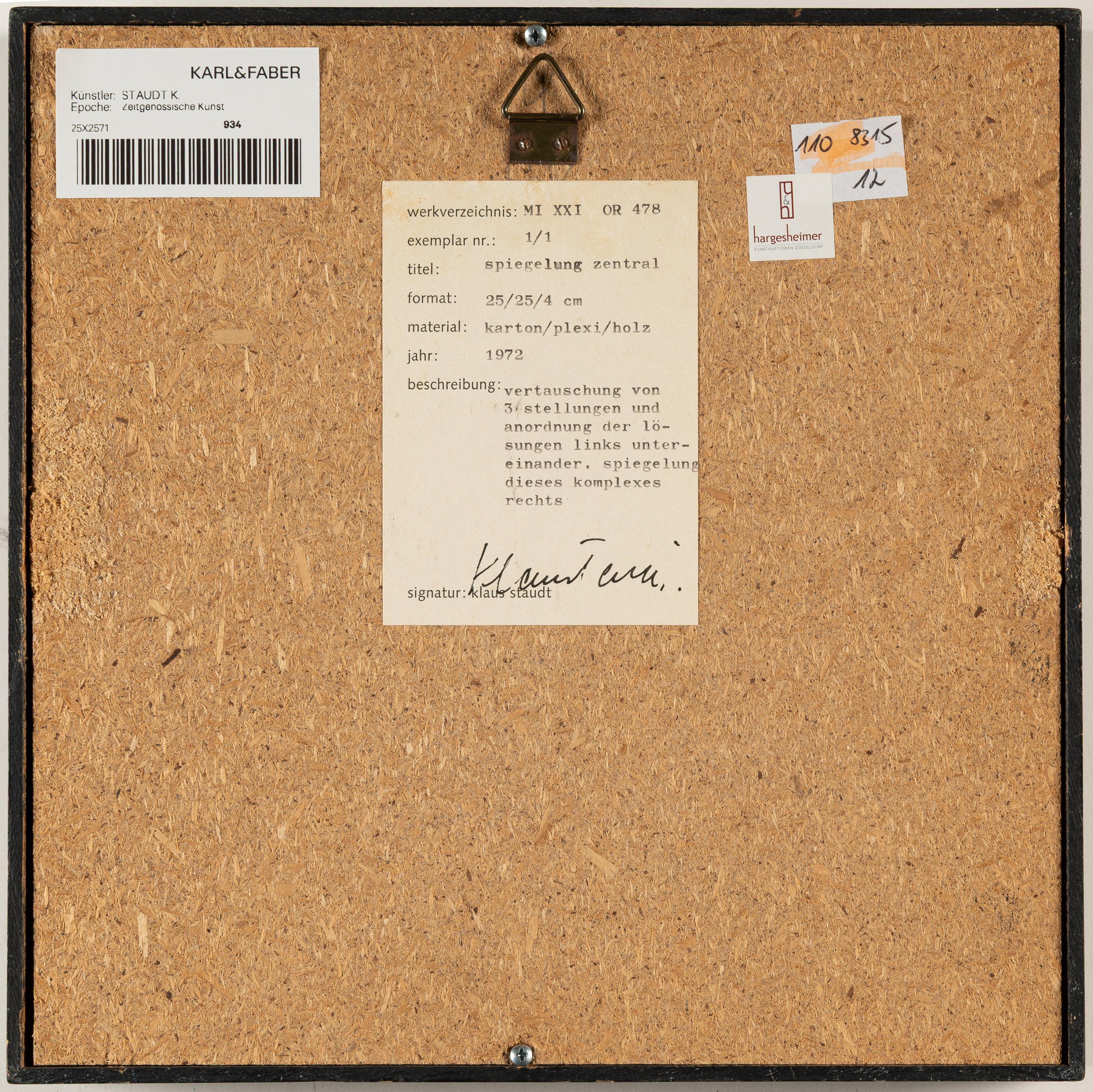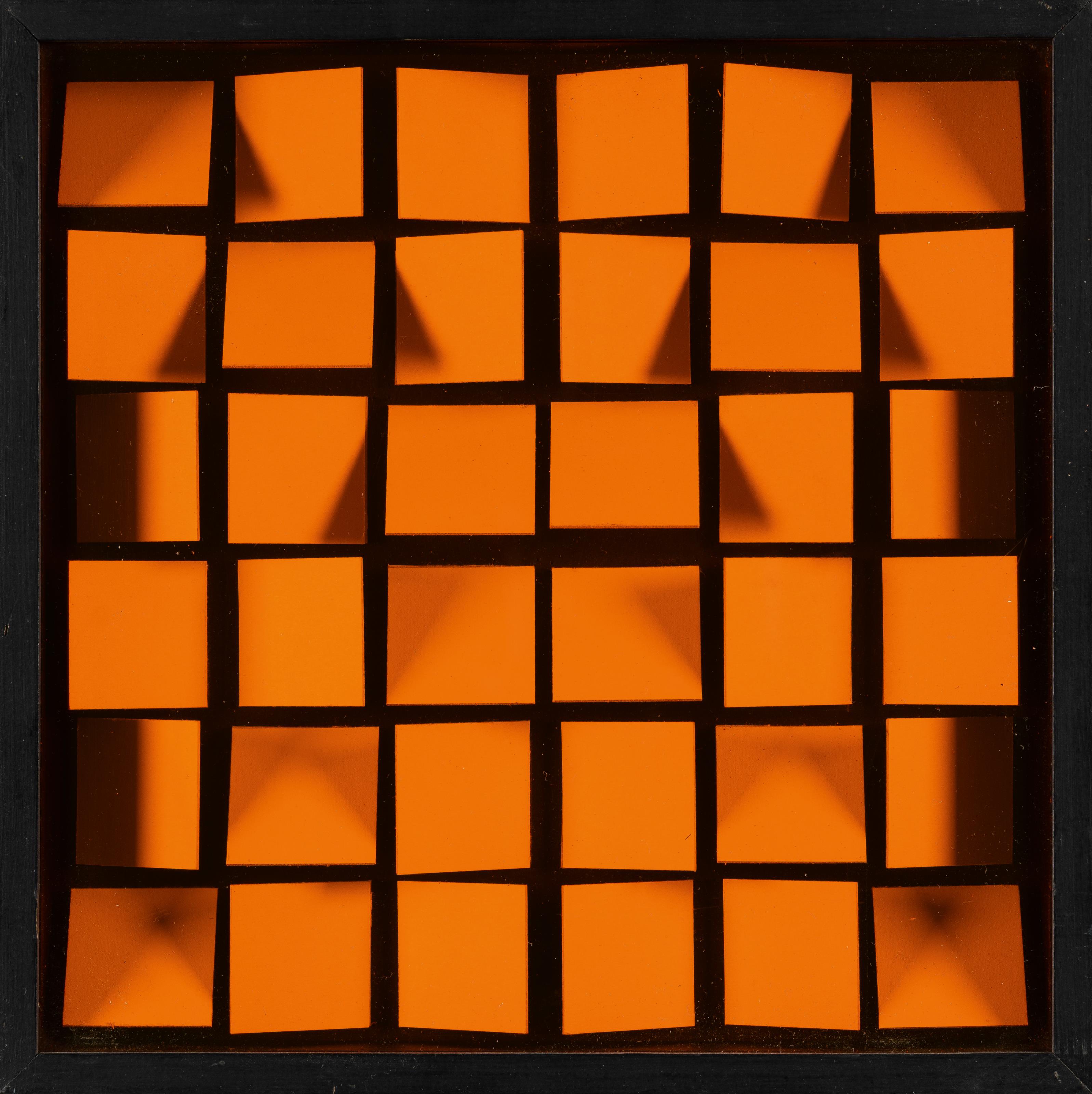 Karton weiß, Plexiglas transparent orange, in O.-Holz-Objektrahmen. 1972. Gesamt ca. 25,5 x 25,5 x 4 cm. Verso auf O.-Etikett signiert sowie typografisch datiert, betitelt und bezeichnet. Unikat.