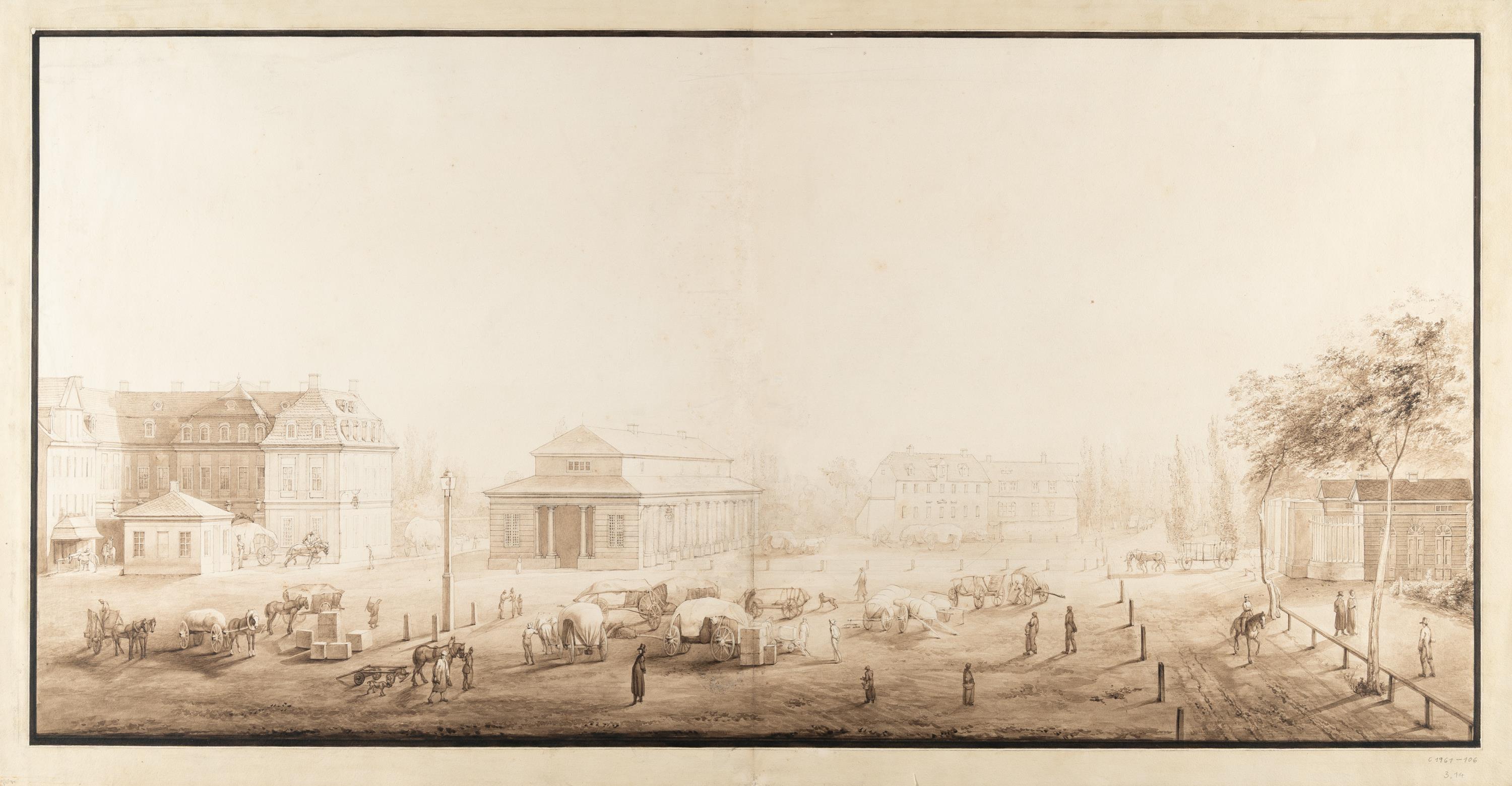 Feder und Pinsel in Braun, braun laviert, auf zwei Bögen festen, zusammengefügten Velins. (Frühes 19. Jh.). 55,9 x 107,2 cm (Blattgröße). Mit einer Einfassungslinie in schwarzem Pinsel.