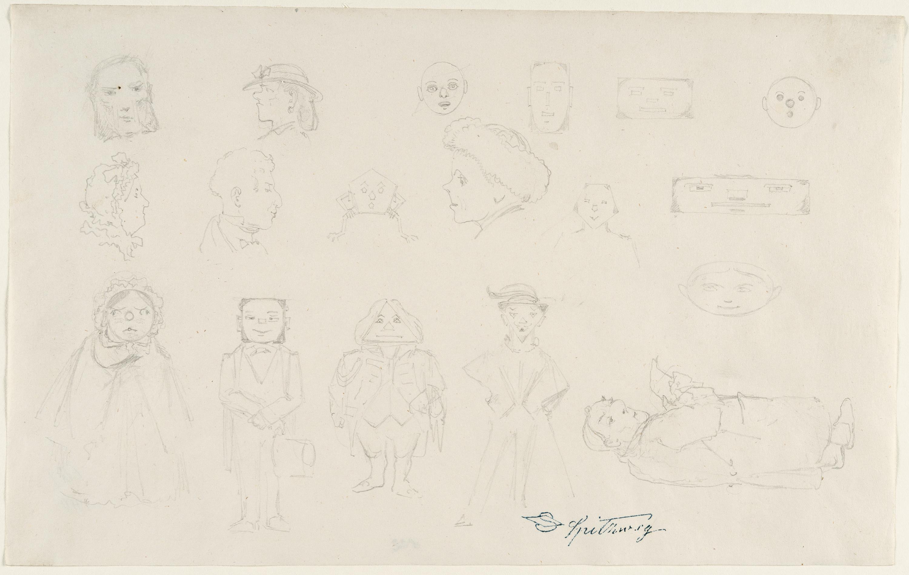 2 Bll.: Studienblatt mit vierzehn grotesken Figuren – Studienblatt mit Kopf- und Figurenstudien