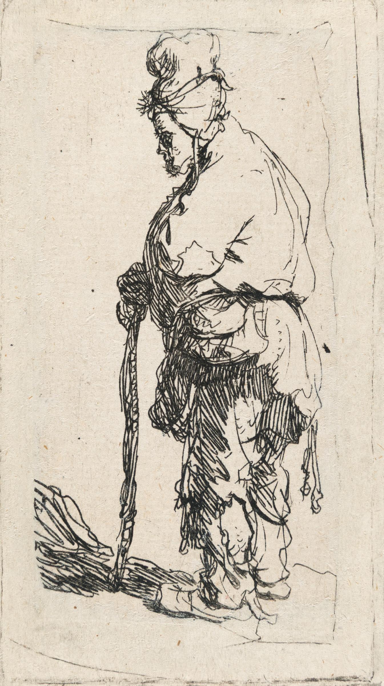 Bettler, der sich auf einen Stock stützt, nach links blickend