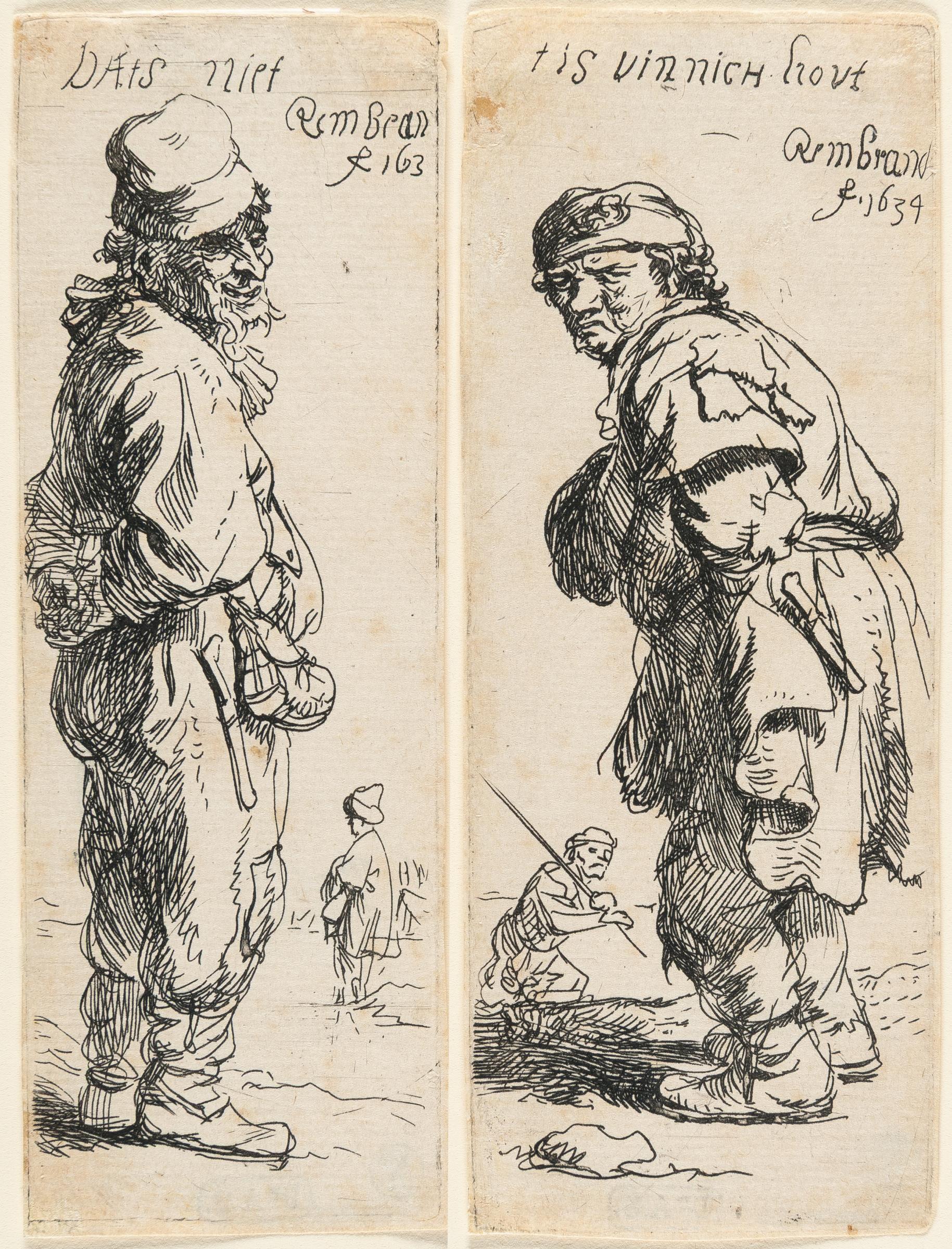 Very fine, sharp impressions of the only states. These two narrow, interrelated etchings revisit the theme and style of Rembrandt’s beggar studies from around 1630, but with a freer, more confident hand. Inspired by two small engravings by Hans Sebald Beham from 1542 (Bartsch 188, 189) – where a similar dialogue unfolds between two peasants – Rembrandt transposes the encounter to a sparsely suggested frozen Dutch landscape. The figures, ragged and wandering, are interpreted as contemporary embodiments of Heraclitus and Democritus – the philosophers of sorrow and laughter. Thread margins. – Light foxing. Thinned along the edges, with a few small tears in the margins, professionally closed with transparent paper. Otherwise in good condition.