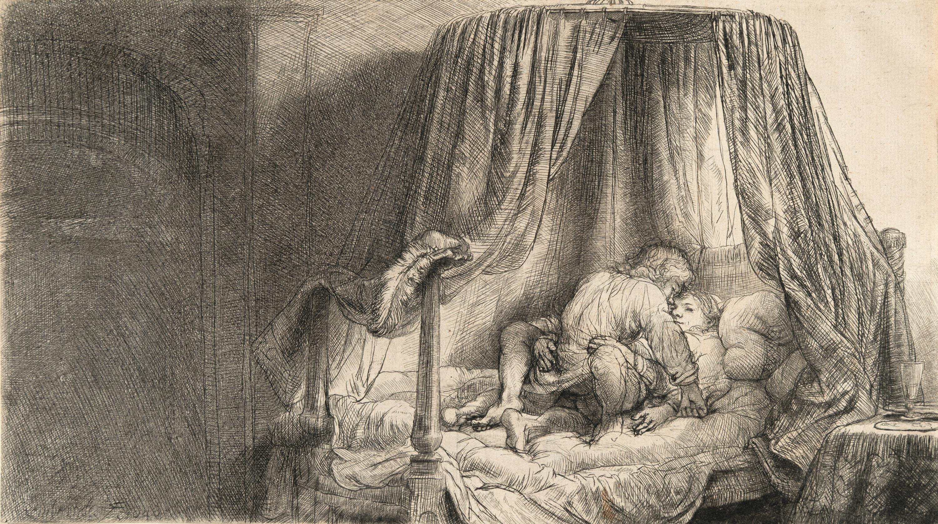 A very fine impression of this rare subject, printing with good burr on the figures and on the bed curtains. Nowell-Eusticke classifies this etching as ‘RRRR - Practically unobtainable’. Only a limited number of impressions are known to be held in museum collections, suggesting firstly that the edition was small, and secondly that many prints may have been destroyed due to the sensitive nature of the subject matter. The printing plate was lost early on. Trimmed to the image. Erotic subjects have been an integral part of European printmaking since its earliest days in the early 16th century. As Ger Luijten points out in his analysis of this etching (Hinterding, 2000, pp. 218–220), the range of such imagery extends from subtle allusions to overtly explicit depictions, as exemplified by Marcantonio Raimondi’s notorious series I Modi (1524). Often, erotic content was disguised in scenes from classical mythology, cautionary tales such as the story of the Prodigal Son, or as allegories of sin. Despite the ever-present risk of censorship, prohibition, or even legal prosecution, there remained a modest but persistent demand for such imagery. Compared to painting, the medium of printmaking offered greater discretion: small editions, privately collected and circulated only among trusted circles. Particularly rare examples include the miniature engravings by the Beham brothers. Rembrandt was undoubtedly familiar with these visual precedents. In his own works, he adopts established motifs of amorous behaviour – such as the canopied bed, the plumed hat or the glass of wine. Yet true to Rembrandt’s subtle, deeply human and often gently humorous character, he makes no attempt to legitimise the subject through mythological reference or moral framing. His portrayal is neither vulgar nor didactic; rather, it conveys a quiet wit and a disarming naturalness – simply two young people enjoying an intimate moment together. The popular Dutch title of this rare print, Ledikant, refers to the unusually opulent bed at the centre of the scene. In prosperous Dutch households of Rembrandt’s time, sleeping quarters were typically built into the wall in the form of box beds. A free-standing, canopied ‘French’ bed like the one depicted here would have suggested wealth – and, perhaps, a certain degree of licentiousness. A small brown spot on the lower right edge. Verso evenly time-stained and with isolated, tiny brown spots. Smoothed horizontal crease marks verso, a small paper thinning to the left of the canopy. Remnants of a former mounting along the edges verso, otherwise in very good condition. Extremely rare!