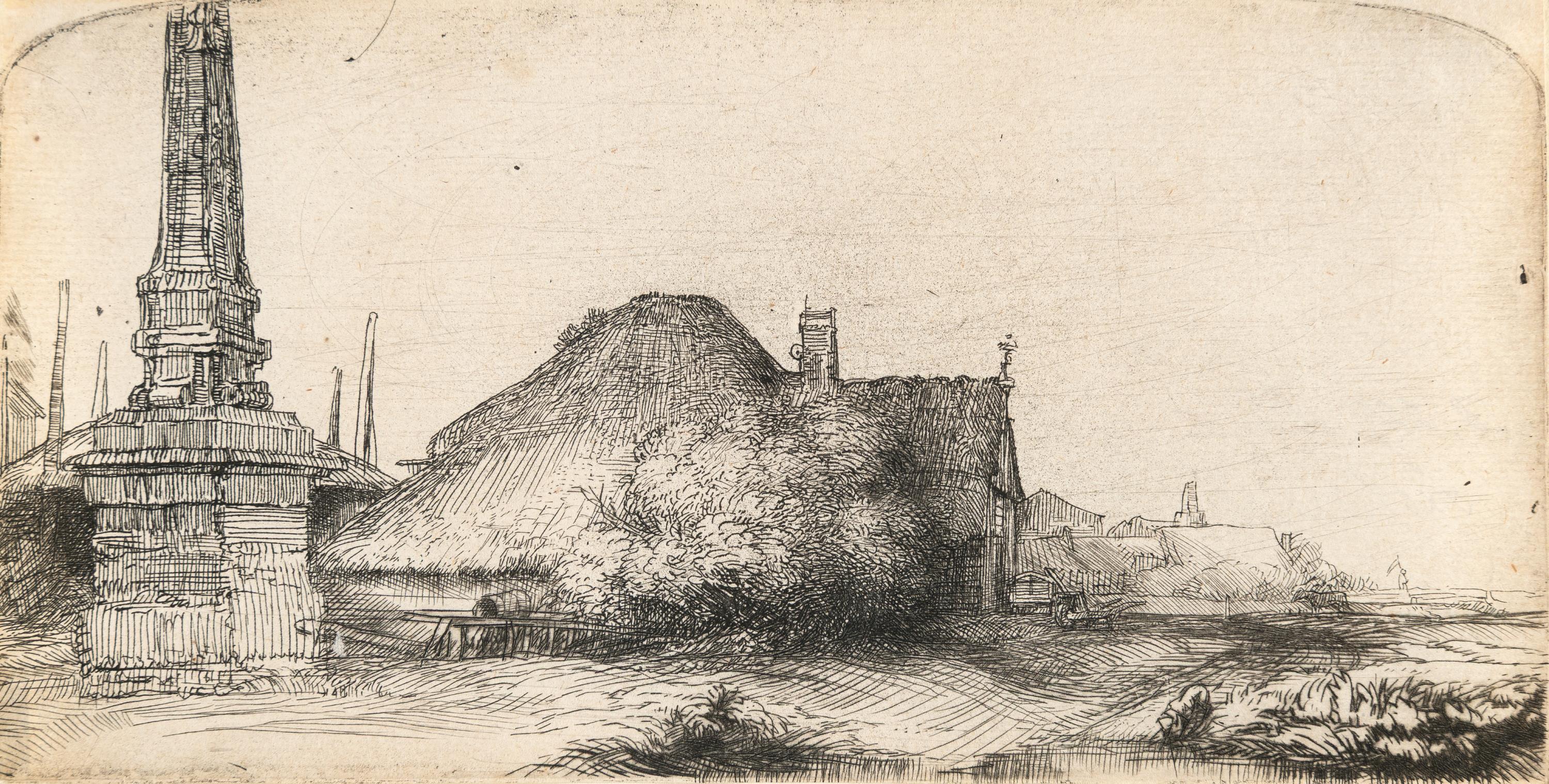 A very fine, atmospheric lifetime impression of the second state of this rare subject, featuring strong burr and strong sulphur tint in the sky. The farm buildings and meadow just behind the wheelbarrow are now shaded by diagonal hatching. Rembrandt's landscape etching depicts the milestone at Spieringshorn on the Spaarndammerdijk, marking the district where suspicious persons were detained and banished individuals were prohibited from staying. This obelisk, erected in 1624 after the city's expansion, is shown with a typical farmhouse of the region, though the additional farmhouse and church tower are Rembrandt's inventions. The artist's use of a semicircular upper edge—common in religious works—elevates this landscape, a genre typically ranked lower in artistic hierarchy. Thread margins; trimmed within the platemark at the lower right. – At the lower left edge, the paper slightly thinned and reinforced on verso. Verso with remnants of a former mounting. Otherwise in good condition.