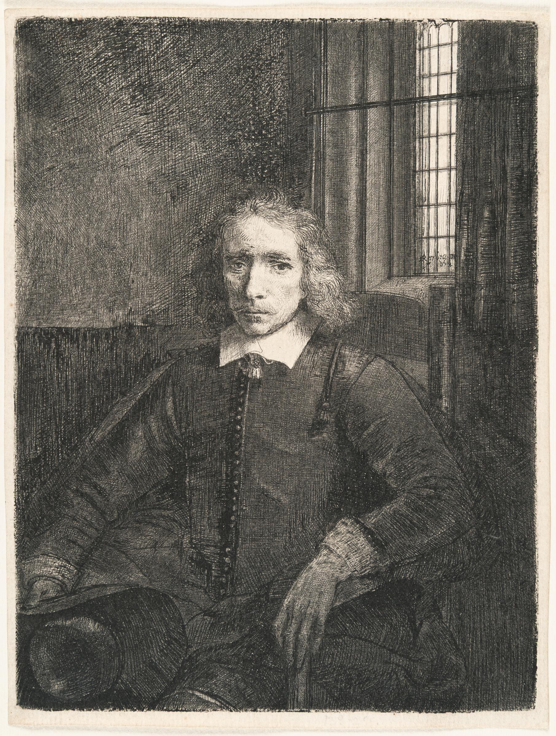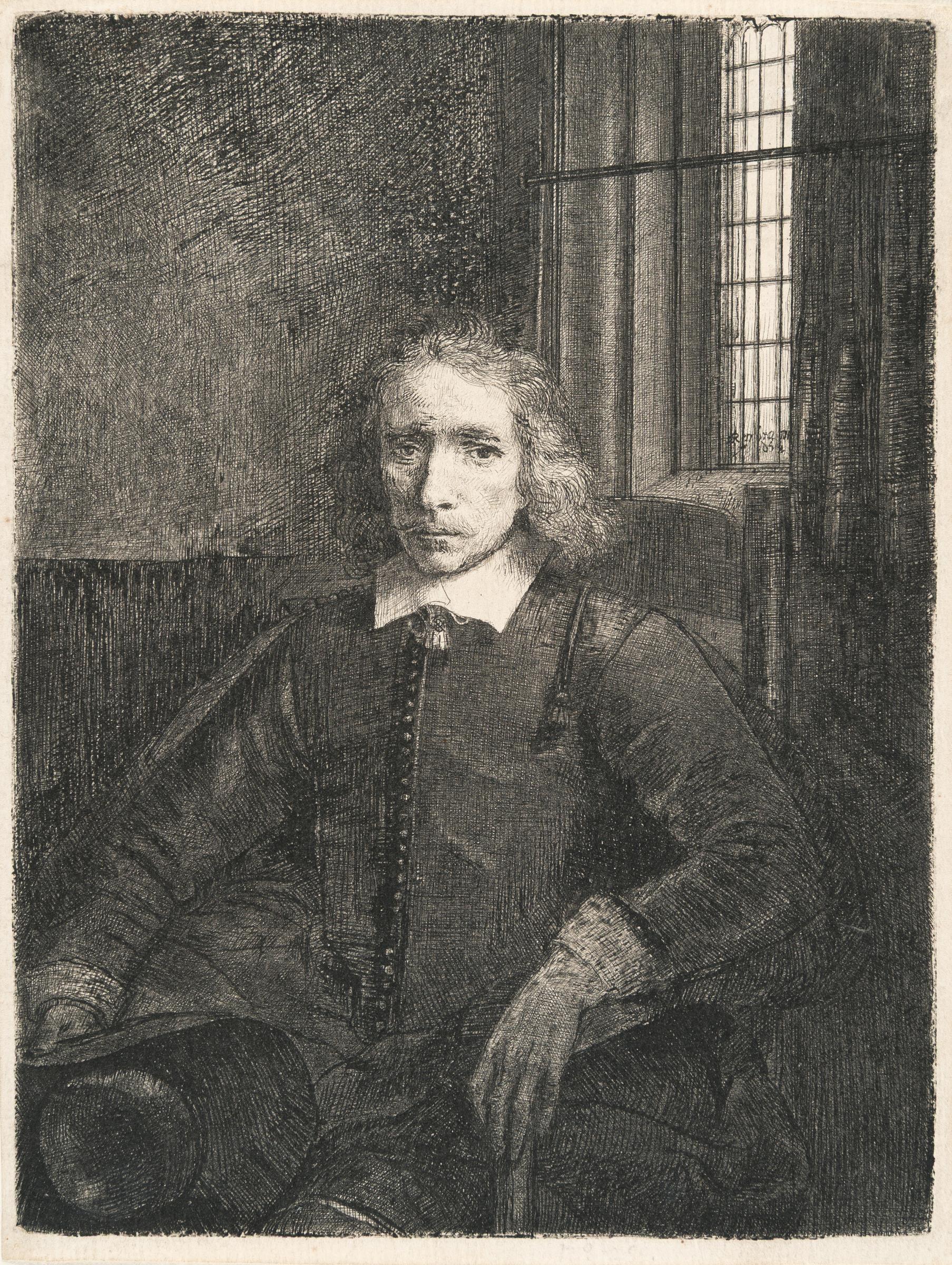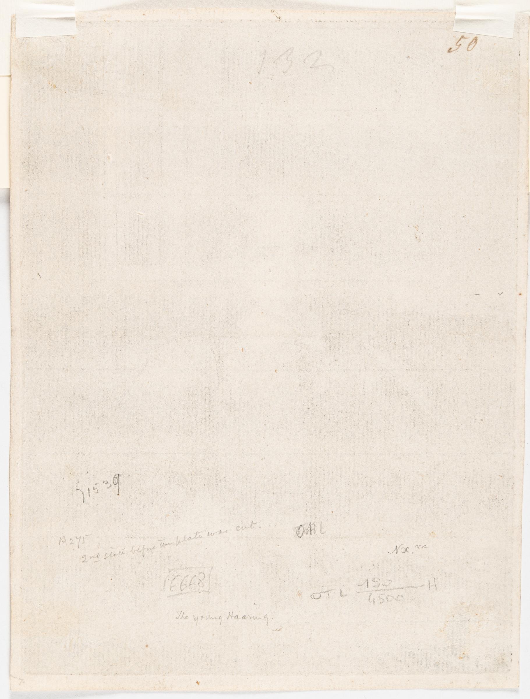A very good, early impression of the second state (of six) printing darkly, with great clarity and depth, intense contrasts and with much burr. With a margin up to 5 mm wide around the platemark. For a considerable time, the figure depicted was identified as Jacob Haaringh, the son of Thomas Haaringh, the Amsterdam official who supervised the liquidation of Rembrandt’s assets following his declared insolvency in 1657 and 1658. Recent research, however, has revealed the sitter to be Pieter Haaringh, a younger relative. Pieter Haaringh held the position of Receiver at the Amsterdam Orphan Chamber and was responsible for overseeing voluntary public auctions. It is presumed that he assisted Rembrandt in the sale of his belongings in 1655, prior to the formal declaration of bankruptcy, and it remains plausible that he acted as auctioneer during that transaction. – Very few isolated tiny brown spots on the reverse, with faint pencil notes and the number ‘50’ in brown ink verso, otherwise in very good condition. Very rare in this early state!