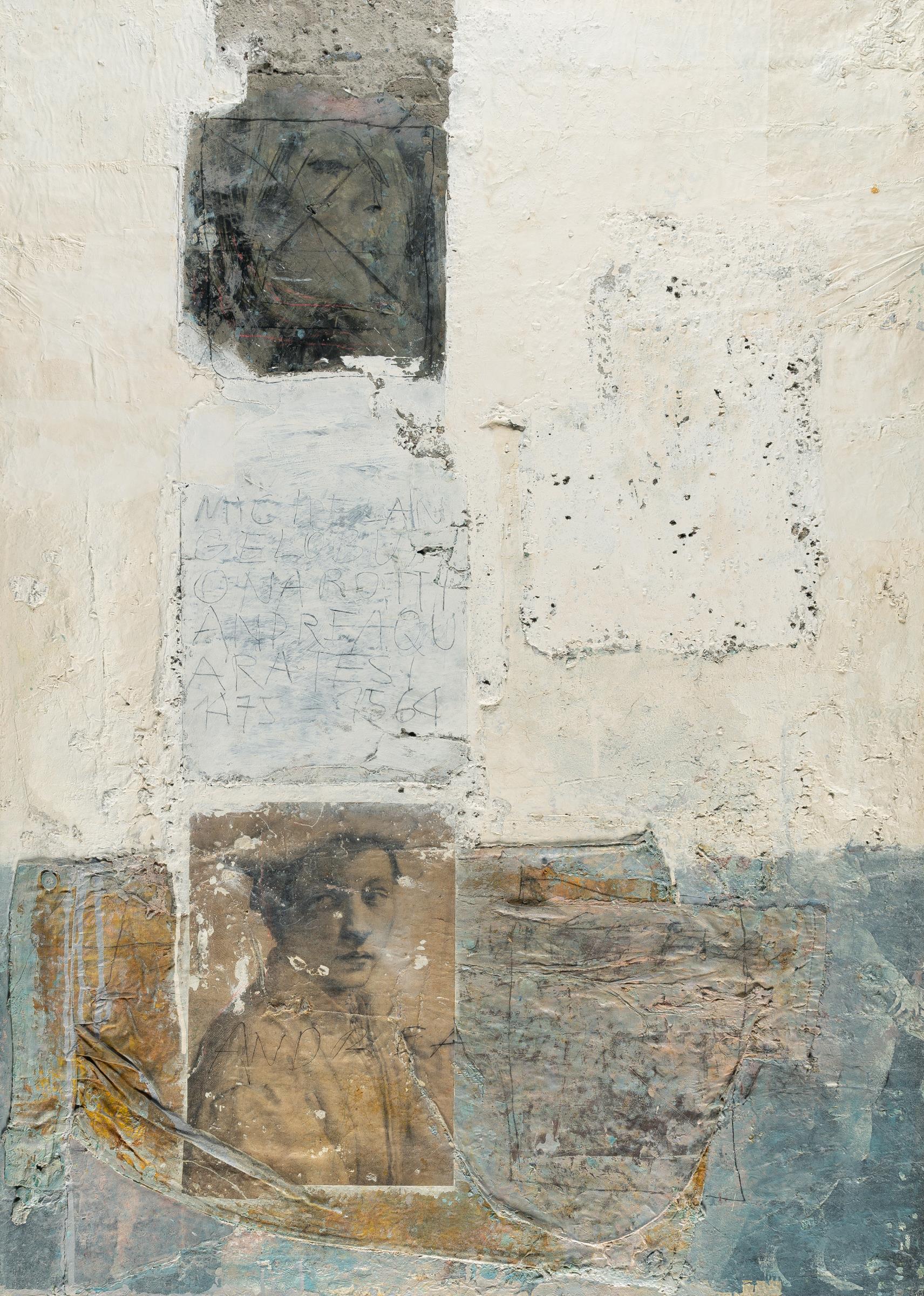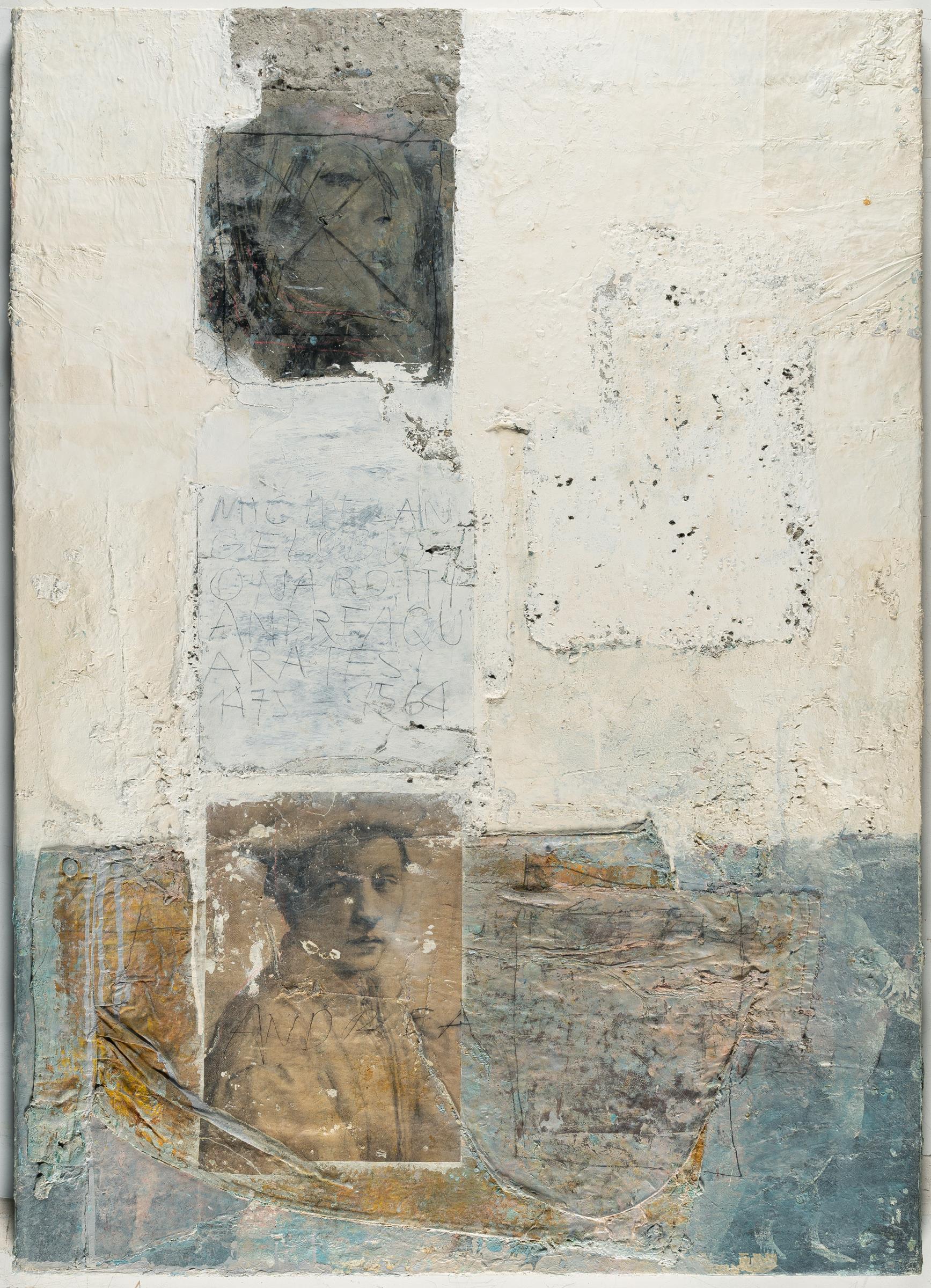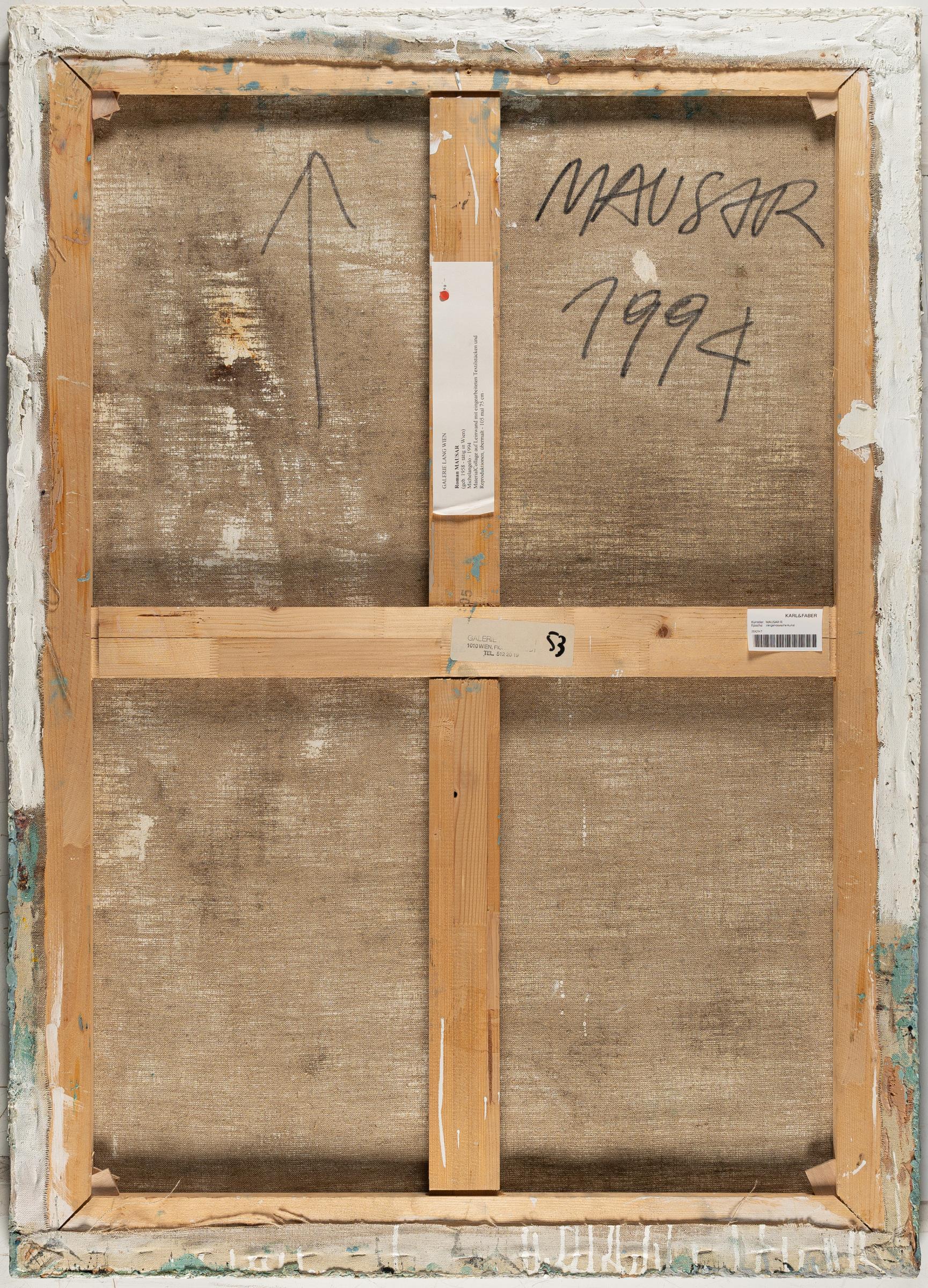 Materialcollage, Textilstücke, Acrylfarbe, Reproduktionen und Harz auf Leinwand. 1994. Ca. 105 x 75 cm. Betitelt mittig. Verso auf der Leinwand signiert und datiert und bezeichnet mit Richtungspfeil.