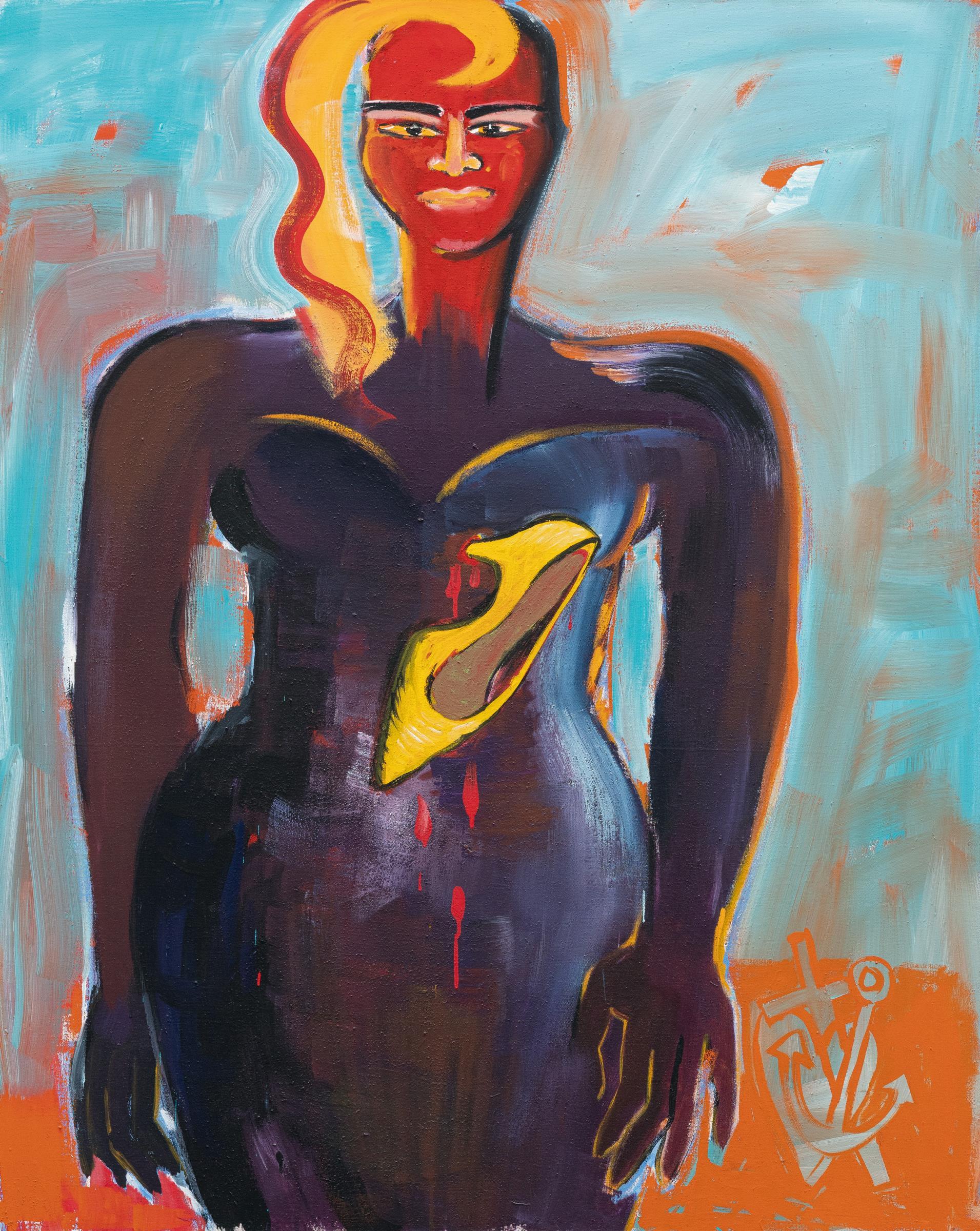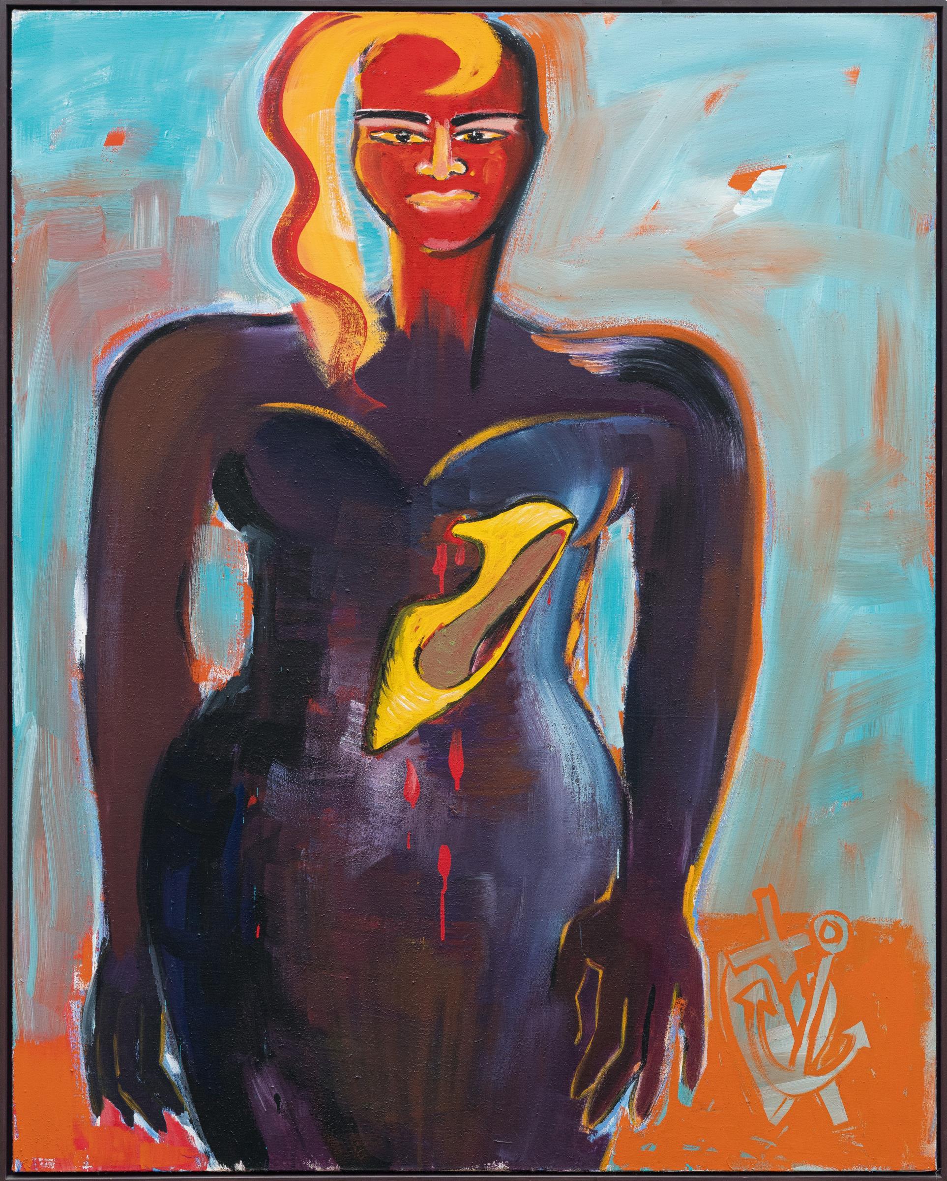 • Für Elvira Bach typisches Motiv einer überproportional dargestellten starken Frau mit breiten Schultern, sinnlich und zugleich kraftvoll
