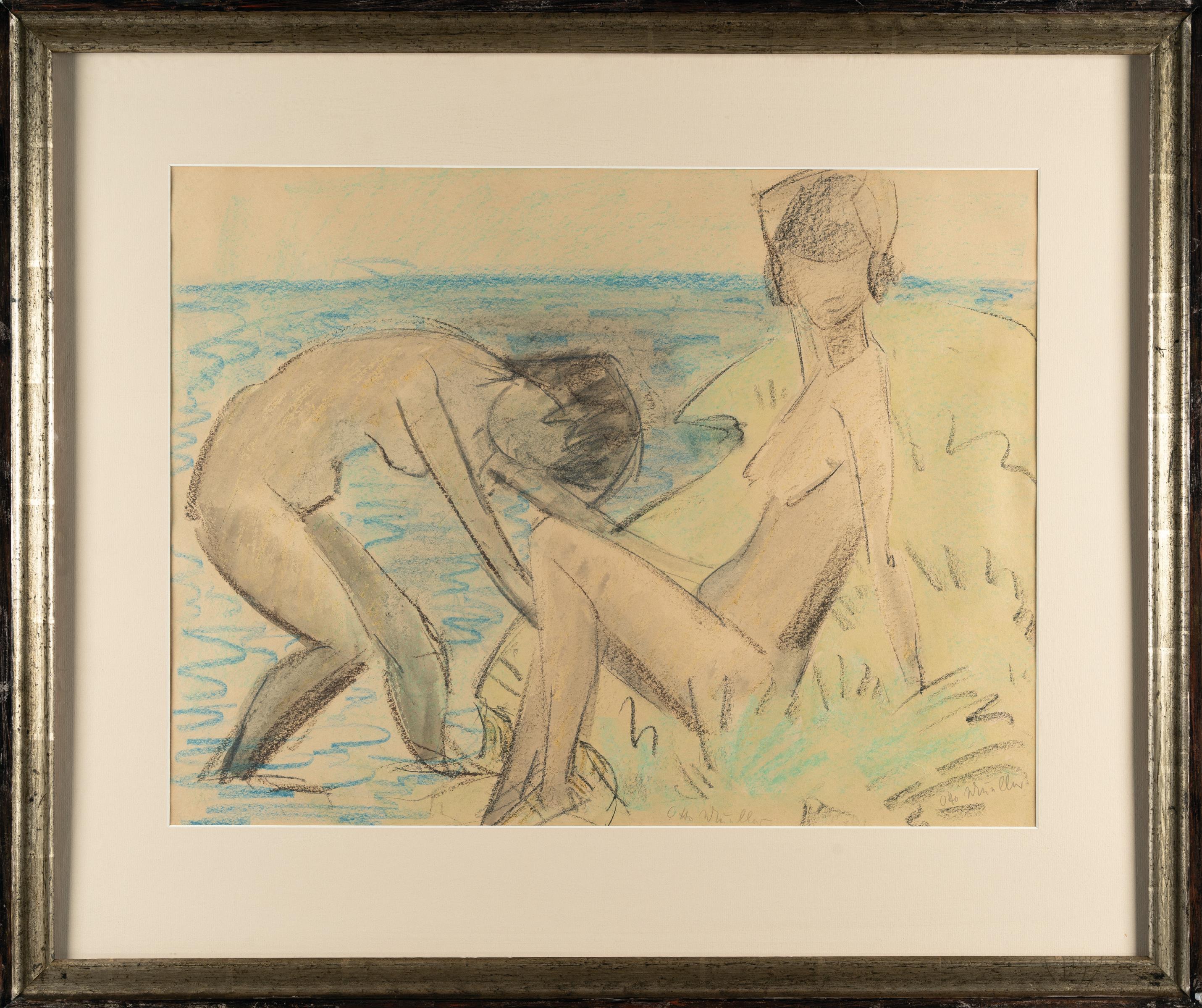 Zwei weibliche Akte finden sich hier in den Dünen direkt am Wasser zusammen. Meer und Vegetation sind durch sanftes Blau und frisches Grün angedeutet, wobei sie die Szene zwar grob verorten, doch keine weiteren Anhaltspunkte geben. Während die eine Frau den Fluten entsteigt, lehnt sich die andere bereits entspannt zurück. Beide sind, ganz im Stil Muellers, detail- und vor allem gesichtslos. In der Wiedergabe der Körper erreicht Mueller eine harmonisch-formale Stilisierung: Die Knie, Bauch und Brüste werden als spitze Formen dargestellt. Dabei zeigt sich Muellers rascher, grafischer Stil in seiner schönsten Form und bietet uns zugleich Identifikationsflächen. Die leeren Gesichter, ja selbst die eigentlich unklare Landschaft, laden zur Interpretation ein, ermöglichen eigene Fantasien von Meer und Kontemplation.