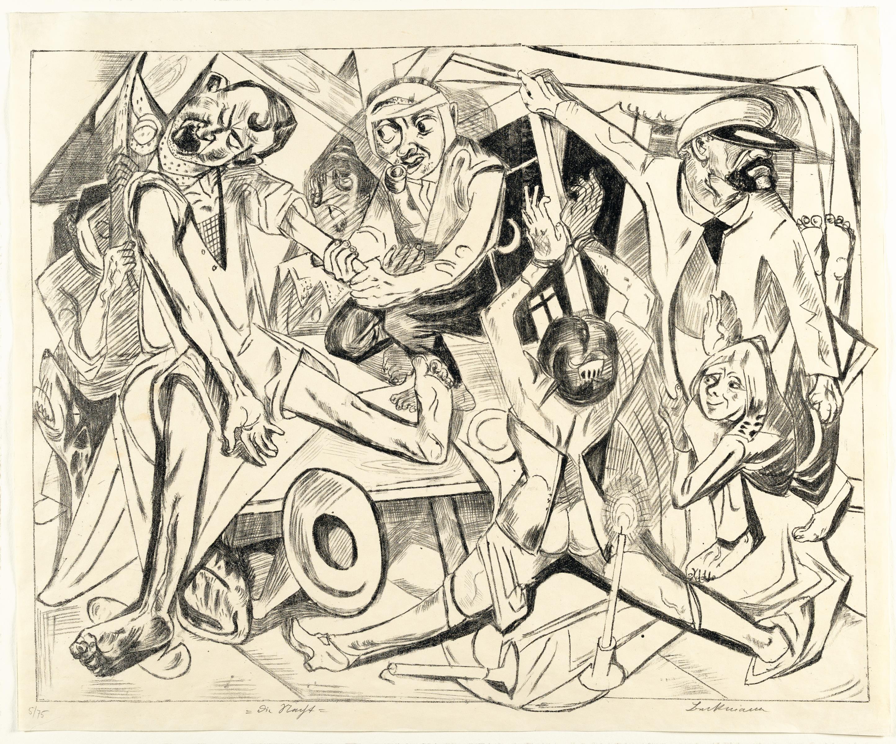 Als er 1918/19 sein Gemälde „Die Nacht“ malt und den dazu passenden Grafikzyklus „Die Hölle“ herausbringt, ist der Erste Weltkrieg gerade vorbei. In Compiègne wird ein Waffenstillstand geschlossen, die Materialschlachten und wahrgewordenen Alpträume in Schützengräben sind vorbei. Heute, über 100 Jahre später, klingt das wie ein Grund zur Freude. Doch die Realität ist eine andere: Im Deutschen Reich eskaliert die Situation bis zur Novemberrevolution 1919, Inflation und Not, Kriegsversehrte und Mittellose, Großstädte gleichen Bürgerkriegsgebieten, es gilt das Recht des Stärkeren. Die von vielen Intellektuellen, etwa Nietzsche und eben auch der von ihm beeinflusste Beckmann, erhoffte reinigende Wirkung des Krieges weicht der Erkenntnis, dass es im Krieg eben nur Verlierer gibt.