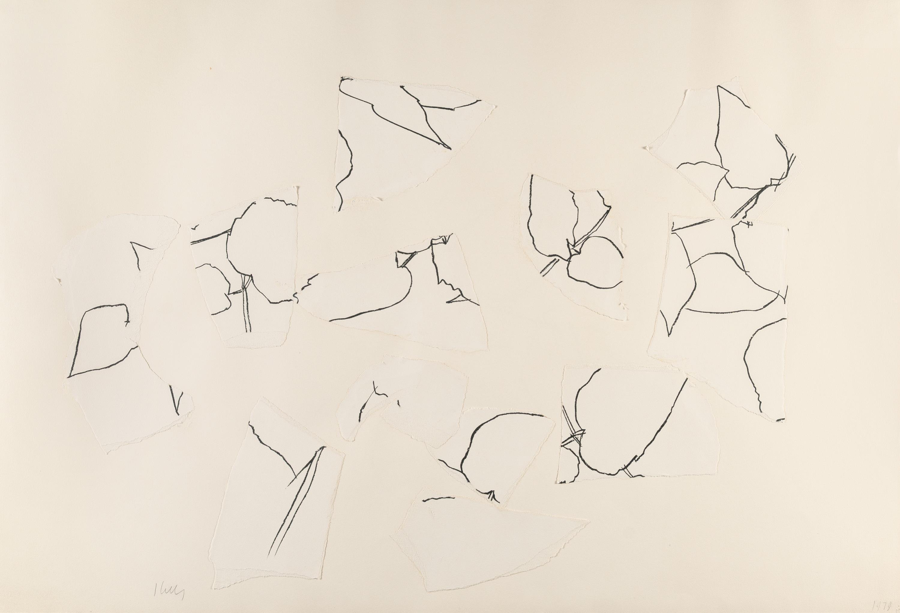 Ellsworth Kelly ist einer der bedeutendsten amerikanischen Künstler, der vor allem für seine großformatigen, monochromen Leinwände bekannt ist. Mit der Verwendung einfacher, klarer Formen und leuchtenden Farben war seine Malerei der Gegenpol zum Abstrakten Expressionismus. Kellys Farbfeldmalerei lieferte einen wichtigen Beitrag zur Malerei des 20. Jahrhunderts. Weniger bekannt sind seine Pflanzenbilder, denen er sich zeitlebens in seinem zeichnerischen und grafischen Werk widmete. Er zögerte lange, seine Zeichnungen zu zeigen, da er fürchtete, es könnte verwirren. Kelly verstand sich selbst ganz klar als abstrakten Maler. Die Collage „Ohne Titel“ ist 1979 entstanden und basiert auf einer Pflanzendarstellung, Kelly hat das Papier zerrissen und neugeordnet zu einer mehrteiligen Komposition. Auf diese Weise widmet er sich grundsätzlichen künstlerischen Fragen von Umriss, Form, Raum, Fläche und Konturen. So schließt sich der Kreis zu seinem Anliegen als Maler, er habe daran gearbeitet, die Form von ihrem Untergrund zu befreien und sie so zu gestalten, dass sie eine eindeutige Beziehung zu ihrem Umfeld habe, wie er selbst formulierte.