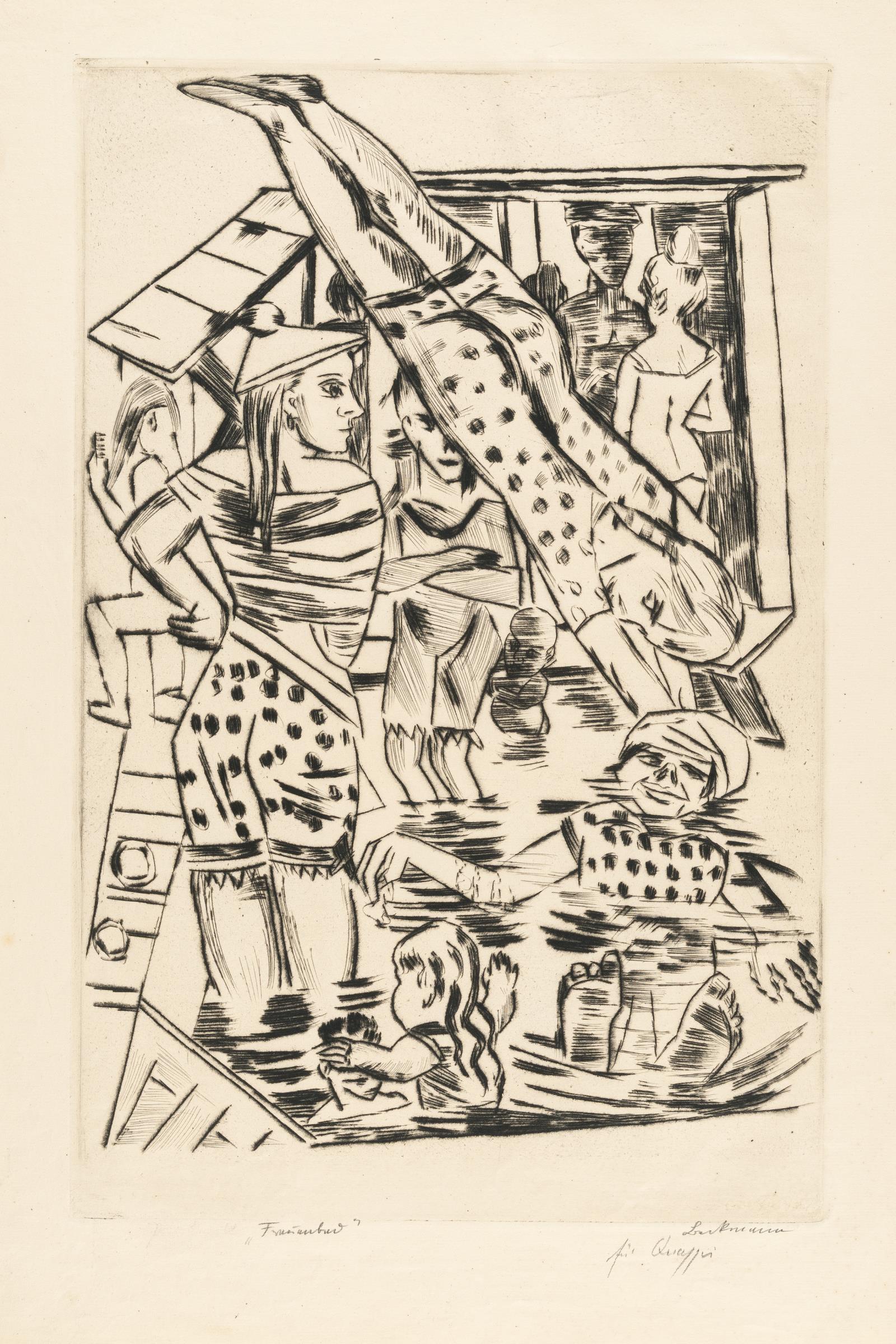 Radierung mit Kaltnadel auf Bütten von J. W. Zanders. (1922). Ca. 43,5 x 28,5 cm (Blattgröße ca. 58 x 38,5 cm). Eines von ca. 8 Probedrucken des 1. Druckzustandes vor der Auflage von 150 Exemplaren. Signiert und gewidmet „Für Quappi“ unten rechts, betitelt unten links.